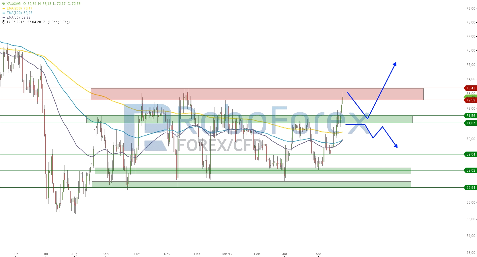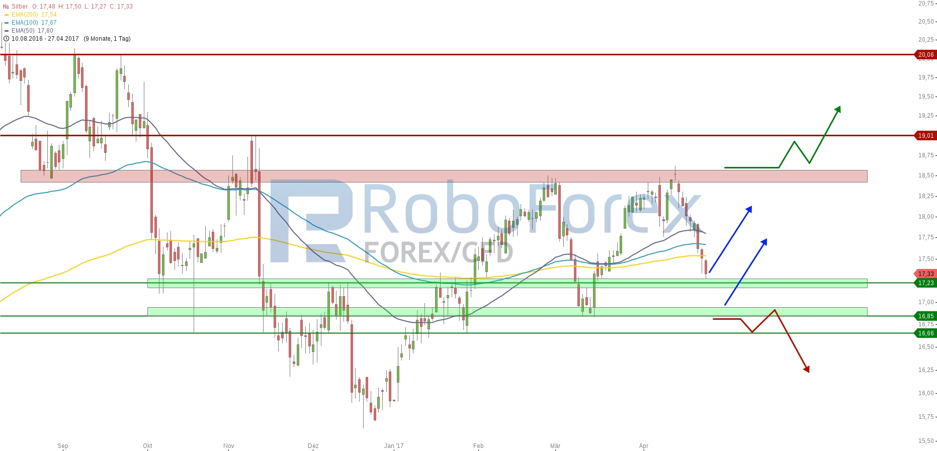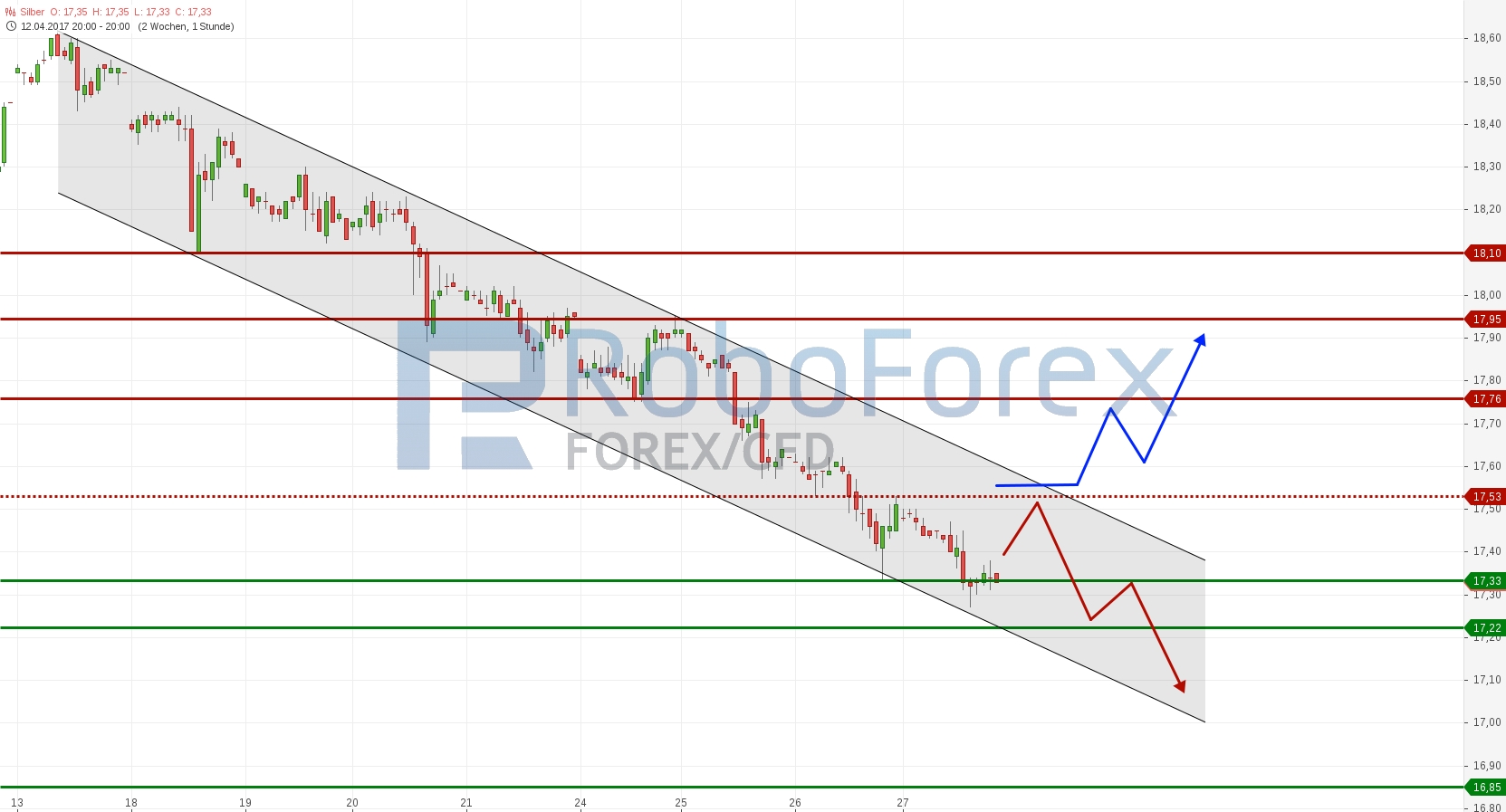 Hier befindet sich die nächste Unterstützung bei 17,23 USD. Diese resultiert aus den Bewegungshochs aus Dezember 2016 und Januar 2017. Sofern es Silber nicht gelingt sich auf diesem Kursniveau zu stabilisieren, dürfte ein weiterer Rücksetzer bis auf 16,85 USD erfolgen. Hier befindet sich mit dem Bewegungstief vom 15. März die nächste mittelfristige Unterstützung. Sollte Silber auch diese Unterstützung nicht verteidigen rückt die Marke bei 16,66 USD und eine sich fortsetzende mittelfristige Abwärtsbewegung in den Fokus der Anleger.