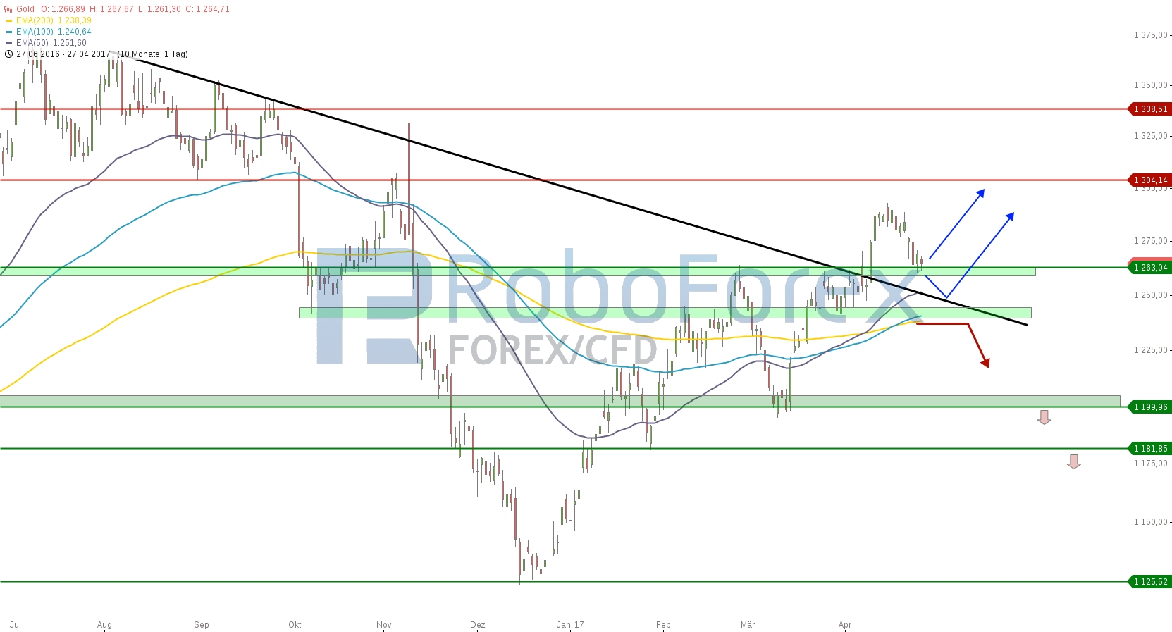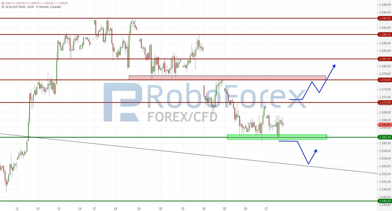 Sofern es Gold nicht gelingt die Marke bei 1.261,- USD zu halten, würde die langfristige Abwärtstrendlinie (schwarz) das nächste Kursziel darstellen.