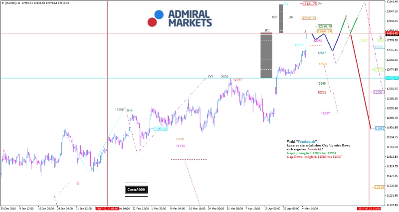 Am Freitag haben vor allem die guten US-Arbeitsmarktdaten und die Aussicht auf den Sieg von Emmanuel Marcon in Frankreich zu einer deutlichen und dynamischen Auswärtsbewegung geführt, ein Teil der Aufwärtsbewegung hat sich nachbörslich eingestellt. Dass der neue französische Präsident mit deutlichem Wahlvorsprung Marcon heißt, haben die Märkte bereits vorweggenommen – somit erwarten wir, dass es am Montag keine große, anhaltende Aufwärtsbewegung gibt. Denkbar ist, dass sich am Montagvormittag schwächere Notierungen durchsetzen könnten („sell the facts“).