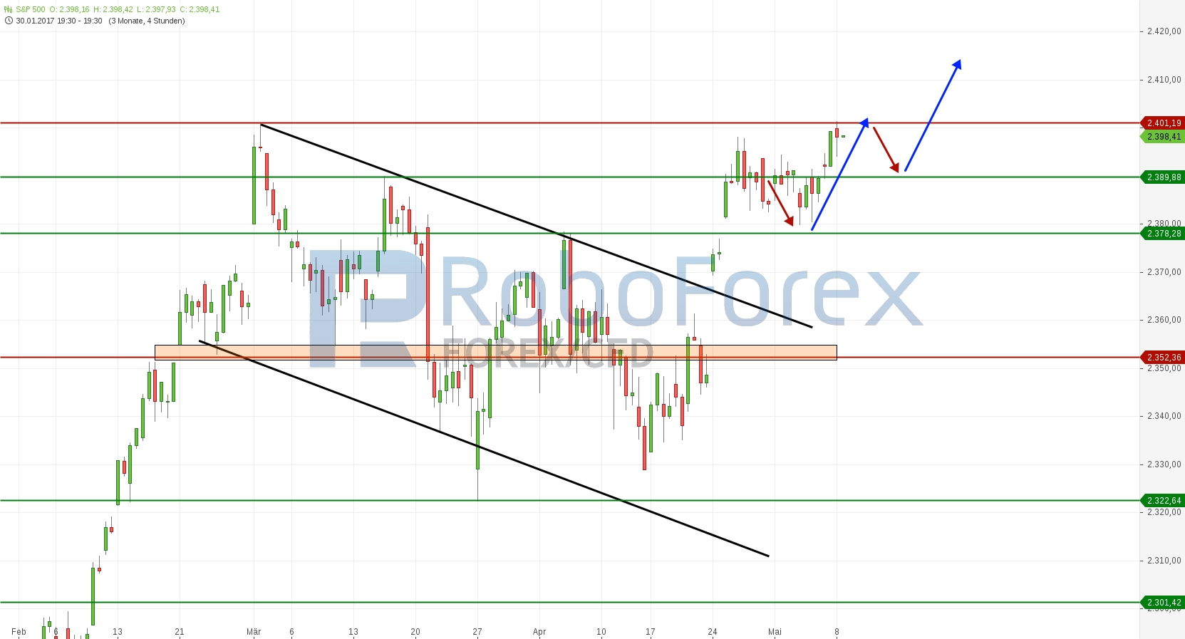 Der S&P 500 hat nach seinem bullishen Ausbruch aus der übergeordneten Flaggenformation und einer temporären Korrektur am gestrigen Handelstag kurzzeitig einen Angriff auf sein bisheriges Allzeithoch bei 2.401 Punkten unternommen und dies auch um einen halben Punkt überschritten. In der Folge kam es allerdings auch beim S&P 500 zu leicht rückläufigen Notierungen, weshalb der S&P 500 zwischenzeitlich wieder deutlich unter 2.400 Punkte auf 2.394 Punkte fiel. Hier befindet sich in Form des gestrigen Tagestiefs zugleich die nächste technische Unterstützungszone.