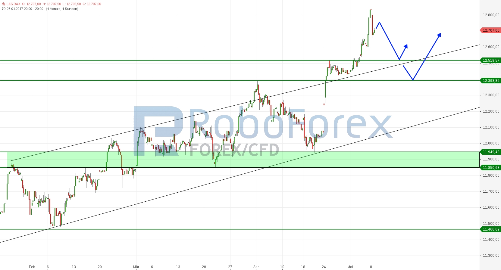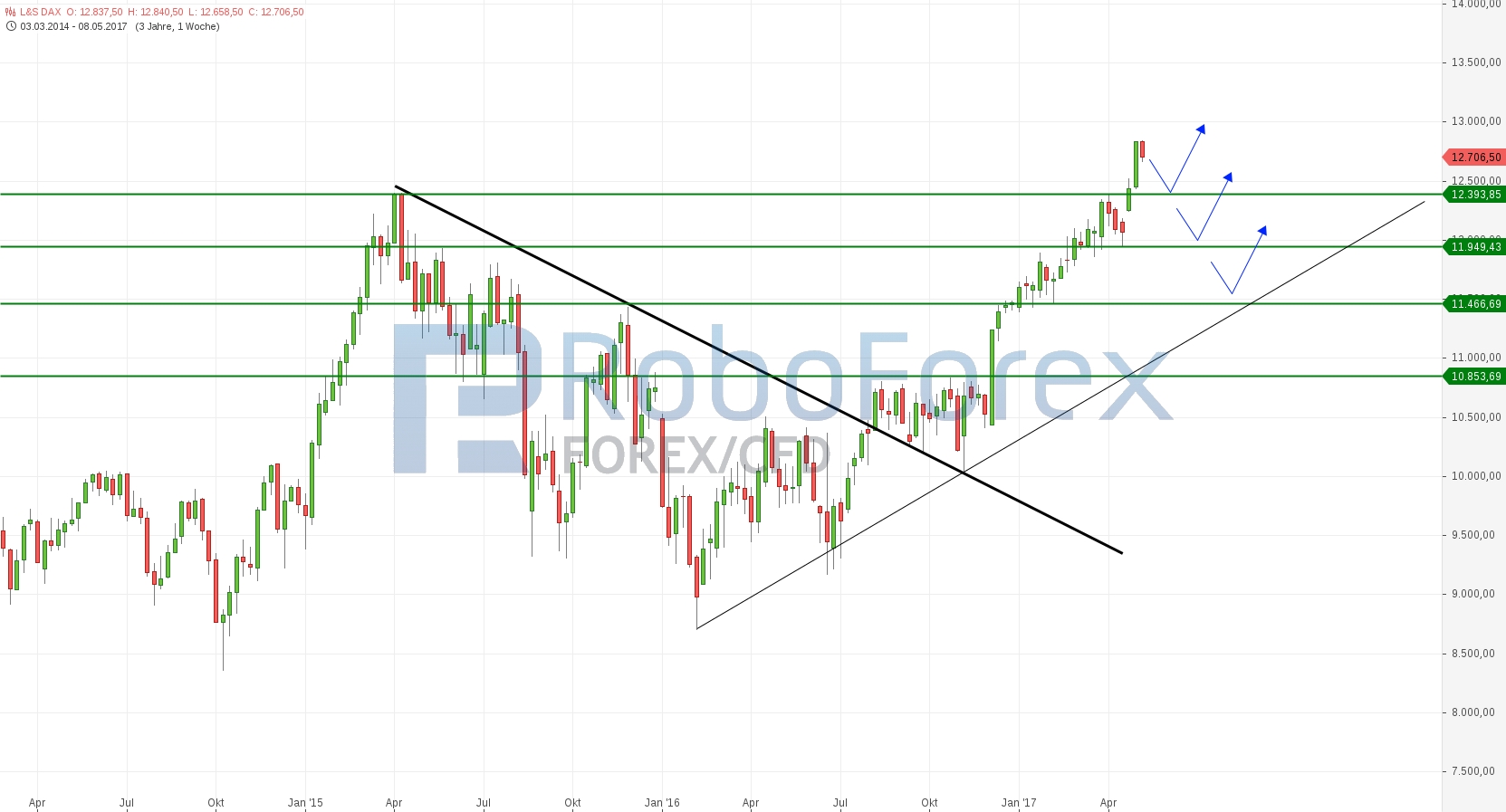 Der deutsche Leitindex eröffnete nach der Wahl von Emmanuel Macron zum französischen Präsidenten äußerst bullish und fiel im weiteren Handelsverlauf dann aber wieder unter die 12.700 Punkte Marke zurück. Dies dürfte auf stärkere Gewinnmitnahmen nach dem erfolgreichen Wahlausgang hindeuten und zeigt abermals, dass mit einem Ereignis, welches im Vorfeld größtenteils eingepreist wurde, nicht mehr viel Rendite zu erwirtschaften ist. Wer hier gleich zu Handelsbeginn Longpositionen eröffnet hat, dürfte im weiteren Handelsverlauf auf dem falschen Fuß erwischt worden sein. Dennoch bleibt der mittelfristige Ausblick unter technischen Gesichtspunkten positiv.