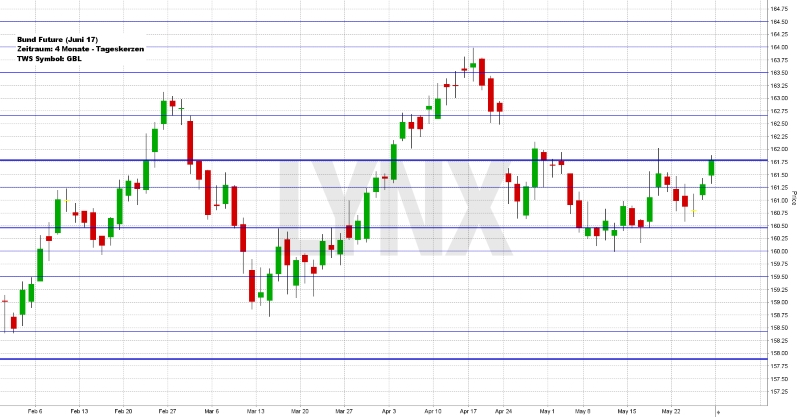 Der Deutsche Aktienindex schloss am Freitag via Xetra mit 12.602,18 Punkten. Der XDAX notierte um 22:15 Uhr mit 12.594,65 Punkten, der FDAX notierte zum Handelsschluss an der EUREX mit 12.591,50 Zählern. Der Dow Jones schloss mit 21.080,28 Punkten, die Rekordmarke liegt bei 21.169,11 Punkten. Der NASDAQ 100 notierte zum Handelsschluss bei 5.788,359 Punkten, der neue Rekord beträgt 5.793,13 Punkte. Der breit gefasste S&P 500 schloss mit 2.415,82 Punkten, der neue Rekord liegt bei 2.418,71 Punkten. Der Euro notierte nach US-Börsenschluss bei 1,1183 US-Dollar. Eine Feinunze Gold war am Spotmarkt für 1.266,76 US-Dollar zu haben, Rohöl der Nordseesorte Brent kostete zum US-Handelsschluss im Juli-Kontrakt 52,15 US-Dollar das Fass. Der Euro-Bund-Future schloss am Freitag an der EUREX mit 161,80 Zählern. Die Rendite für zehnjährige Bundesanleihen liegt aktuell bei 0,33 Prozent. Der Spread zwischen zehnjährigen deutschen Bunds und zehnjährigen US-Staatsanleihen (2,25 Prozent Rendite) liegt derzeit bei 192 Basispunkten. In der neuen Handelswoche wird die Finanzagentur des Bundes keine Auktion vornehmen.
