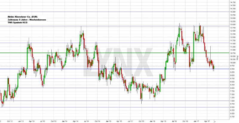Der Chartverlauf der Aktie von Kloeckner Co. zeigt aus trendfolgender Sicht mehr oder weniger ein „Bild des Grauens“. In den vergangenen fünf Handelsjahren konnte der Wert keinen nennenswerten und ausnutzbaren Trend ausbauen und tendierte mehrheitlich seitwärts. Zwar reichen die Grenzen des sich zeigenden Seitwärtstrends von 6,50 Euro bis auf rund 13,00 Euro, was prozentual mehr als 100 Prozent Bewegung bedeutet – wirklich saubere, nutzbare Bewegungen konnten jedoch nicht ausgebaut werden. Mit Blick auf die letzten 12 Monate zeigt sich ebenfalls eine Seitwärtszone, wobei sich die untere Grenze im Bereich 9,50 Euro behauptet hat. Auch der Schlusskurs zum vergangenen Freitag lag in diesem Bereich und somit am unteren Ende des Seitwärtszonenbereichs. Auf Grundlage der charttechnischen Analyse stellt sich die Frage, ob ein Handel des Wertes überhaupt Sinn macht. Die teilweise schnellen Richtungswechsel könnten sich auch in Zukunft fortsetzen und würden eventuelle Buchgewinne schnell auffressen. Gegebenenfalls ergibt sich mit dem Test der unteren Seitwärtszonengrenze eine kleine Chance auf kurzfristiger Ebene, da ein Abprallen eventuell bis 10,75 Euro durchaus stattfinden könnte. Wenn Aktionen in diesem Wert aber umgesetzt werden sollten, dann mit einer an die Analyse angepassten Positionsgröße.