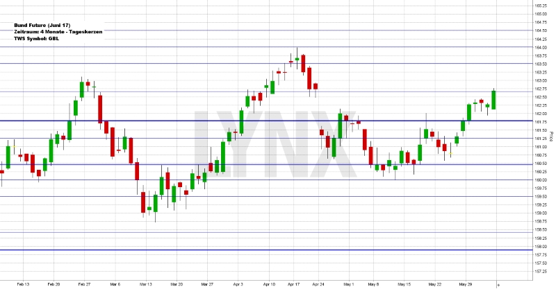 Der Deutsche Aktienindex schloss am Freitag via Xetra mit 12.822,94 Punkten. Das Handelsvolumen betrug 3,476 Mrd. Euro. Der XDAX notierte um 22:15 Uhr mit 12.856,43 Punkten, der FDAX notierte zum Handelsschluss an der EUREX mit 12.854,00 Punkten. Der Dow Jones schloss mit 21.206,29 Punkten, die Rekordmarke liegt bei 21.225,04 Punkten. Der NASDAQ 100 notierte zum Handelsschluss bei 5.881,46 Punkten was auch gleichzeitig den neuen Rekord darstellt. Der breit gefasste S&P 500 schloss mit 2.439,07 Punkten, der neue Rekord beträgt 2.440,23 Punkte. Der Euro notierte nach US-Börsenschluss bei 1,1279 US-Dollar. Eine Feinunze Gold war am Spotmarkt für 1.279,17 US-Dollar zu haben, Rohöl der Nordseesorte Brent kostete zum US-Handelsschluss im August-Kontrakt 49,95 US-Dollar das Fass. Der Euro-Bund-Future schloss am Freitag an der EUREX mit 162,68 Zählern. Die Rendite für zehnjährige Bundesanleihen liegt aktuell bei 0,27 Prozent. Der Spread zwischen zehnjährigen deutschen Bunds und zehnjährigen US-Staatsanleihen (2,16 Prozent Rendite) liegt derzeit bei 189 Basispunkten. In der neuen Handelswoche plant die Finanzagentur des Bundes am Mittwoch, den 07.06.2017 eine Auktion von Kapitalmarktinstrumenten (Bobl) mit fünfjähriger Laufzeit. Die mit einem Volumen von 3,0 Mrd. EUR avisierte Auktion ist eine Aufstockung.