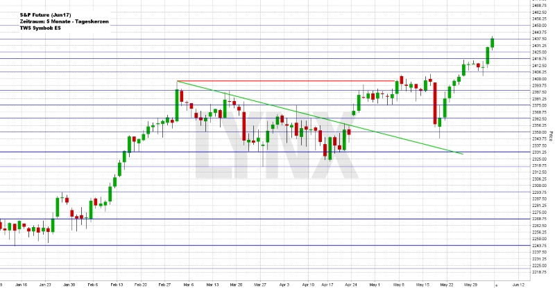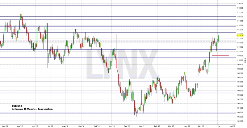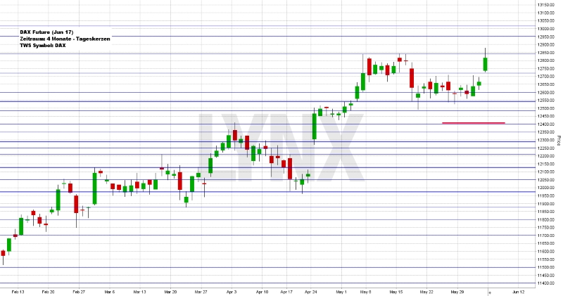 Der deutsche Leitindex DAX erzielte am Freitag gemeinsam mit den drei wichtigsten US-Indizes Dow Jones, NASDAQ100 und dem S&P 500 neue Rekordstände. Vor allem die Stärke des US-Marktes, insbesondere der Indizes NASDAQ 100 und S&P 500, ist beeindruckend. Mit sehr hoher Wahrscheinlichkeit werden in den USA die Zinsen in 14 Tagen angehoben. Es könnte also gut möglich sein, dass der Markt bis zum 14.06.2017 noch etwas zulegt und die Zinserhöhung dann abverkauft wird.