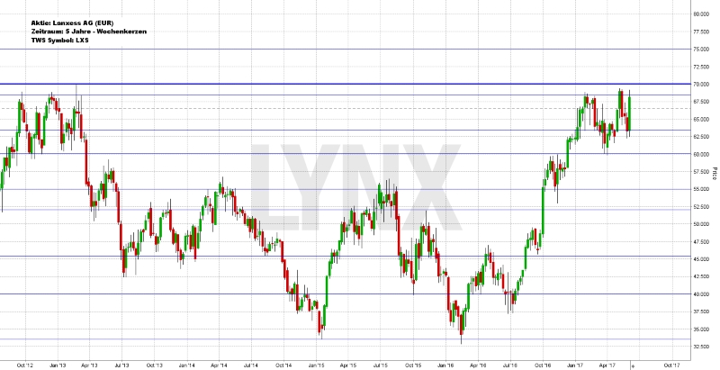 Mit Blick auf die Bewegungen der vergangenen fünf Handelsjahre der Lanxess-Aktie ist zu beobachten, dass der Wert bis Anfang 2016 tendenziell eher abwärts tendierte und Käufe nur wenig interessant für gewinnbringende Trades waren. Ende 2012 rangierte der Wert noch im Bereich um die Marke von 65,00 Euro, danach ging es mehrmals bis auf Tiefs unter 35,00 Euro hinab. Seit Februar 2016 konnte sich die Aktie recht gut erholen und kletterte bis zum Wochenschluss am vergangenen Freitag erneut in Kursbereiche um die Marke von 65,00 Euro – also zurück in alte Gefilde. Der Freitagsschlusskurs konnte im Bereich 67,70 Euro abgelesen werden. Mit dem Rücklauf in die Kursbereiche von Ende 2012 und Anfang 2013 steht der Wert aus charttechnischer Sicht kurz vor einem eventuellen Ausbruch über die charttechnisch wichtige Marke von 70,00 Euro. Eine Spekulation auf diesen Bruch könnte durchaus eine Überlegung wert sein, da der Trendvorteil klar auf der Seite eines Ausbruchs steht. Etwas defensiver könnte die Überlegung sein, den Ausbruch vorerst abzuwarten, um im Anschluss die eine oder andere Tradingidee umzusetzen. Hier käme etwa ein möglicher Rücklauf an das Ausbruchsniveau in Frage. Verkäufe sind aktuell noch nicht nötig und erst ein nachhaltiger Rutsch unter die Unterstützung von 60,00 Euro würde das Bild des Longvorteils etwas eintrüben und Verkäufe denkbar machen.