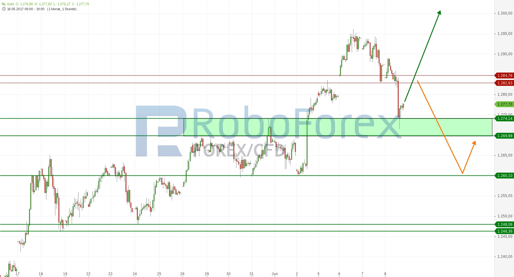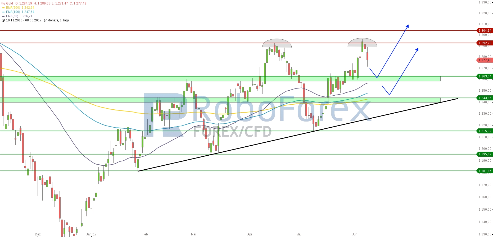 Allerdings ist ebenso eine technische Gegenbewegung bis in den Bereich um 1.283,- USD denkbar, von wo eine weitere bearishe Impulsbewegung gestartet werden könnte. In diesem Fall rückt die nächste Unterstützung bei 1.260,- USD in den Fokus.