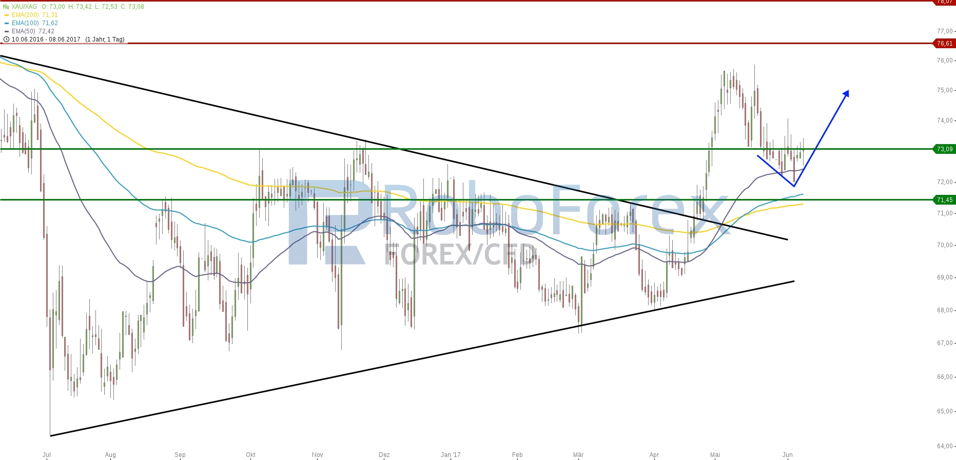 Das gelbe Edelmetall konnte zu Wochenbeginn deutliche Kursgewinne verbuchen und stieg in der Spitze bis auf 1.296,- USD an, wodurch ein neues Siebenmonatshoch verzeichnet wurde. Dabei profitierte Gold von den neuen politischen Spannungen in der Golf-Region und dem schwächer ausgefallenen US-Arbeitsmarktbericht vom Freitag. Hier wurden die Erwartungen von 184.000 neuen Stellen mit lediglich 138.000 neuen Stellen deutlich verfehlt, was die Erwartungen an eine Zinsanhebung des FED über die nächste Sitzung hinaus schmälerte. Zudem wurde der Stellenzuwachs in den beiden Vormonaten März und April um insgesamt 66.000 Stellen nach unten korrigiert.