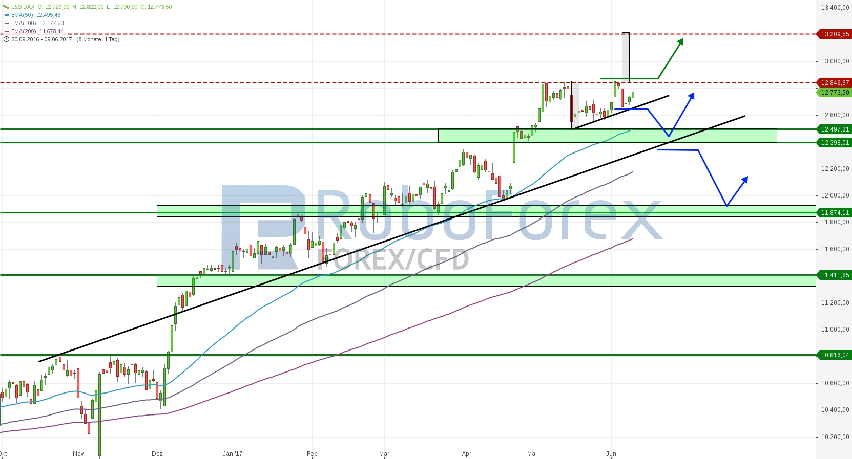 Der deutsche Leitindex präsentierte sich in der vergangenen Handelswoche trotz EZB, Wahl in Großbritannien und der Anhörung des ehemaligen FBI-Chefs Comey relativ stabil und befindet sich damit weiterhin in einer bullishen Konsolidierungsphase. Von den Kursverlusten an der Wall-Street und insbesondere bei den Tech-Werten blieb der DAX noch unberührt. Hier kam es im späten Handel am Freitag zu stärkeren Gewinnmitnahmen.