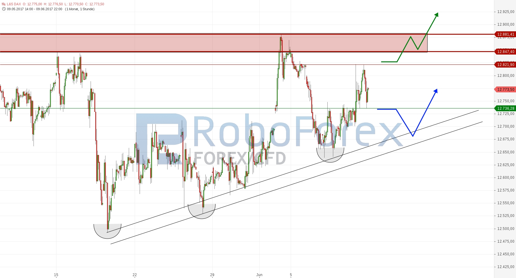 Der Widerstandsbereich befindet sich in diesem Fall zwischen 12.845 und 12.885 Punkten. Sofern es dem DAX gelingt diesen Bereich bullish zu triggern, liegt ein mögliches Kursziel neben der psychologischen 13.000 Punkte Marke bei 13.200 Punkten. Dieses Kursziel ergibt sich aus der Konsolidierungsformation und dem möglichen Ausbruchsniveau.