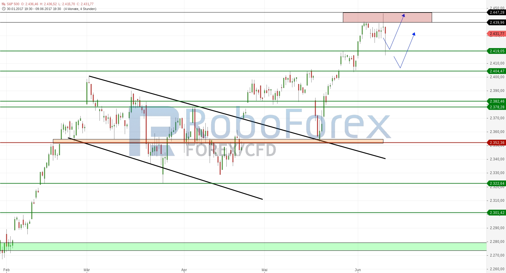 Allerdings sollten Anleger nach der temporären dynamischen Korrektur auch das weitere Verhalten des S&P 500 in dem o.a. Widerstandsbereich genau beobachten. Sollte der S&P 500 hier erneut an Dynamik verlieren und sich die spät einsetzende Nachfrage zum Wochenstart nicht fortsetzen bzw. der S&P 500 erneut eine bearishe Bewegung vollziehen, bietet neben dem Vortagestief bei 2.415 Punkten die Marke bei 2.404 Punkten erneut die Chance auf eine Stabilisierung und eine übergeordnete Trendfortsetzung.