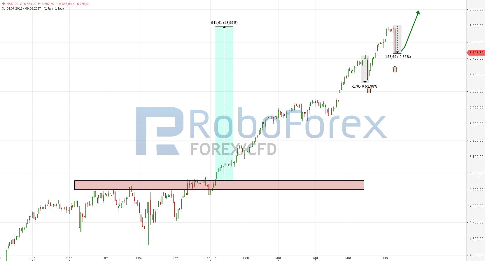 Eine ähnliche Korrektur verzeichnete der Nasdaq bereits am 17. Mai als es ebenfalls einen Tagesverlust von knapp 3 Prozent gab. Im Anschluss kehrten die Käufer aber wieder zügig an den Markt zurück und glichen den Verlust innerhalb von drei Tagen wieder aus. Ein ähnliches Szenario könnte nun ebenfalls den Anlegern bevorstehen. Dennoch sollte man Vorsicht walten lassen und neue Positionen unterhalb des Tagestiefs vom Freitag absichern, da auch der Beginn einer mittelfristigen Korrektur nicht ausgeschlossen werden kann.