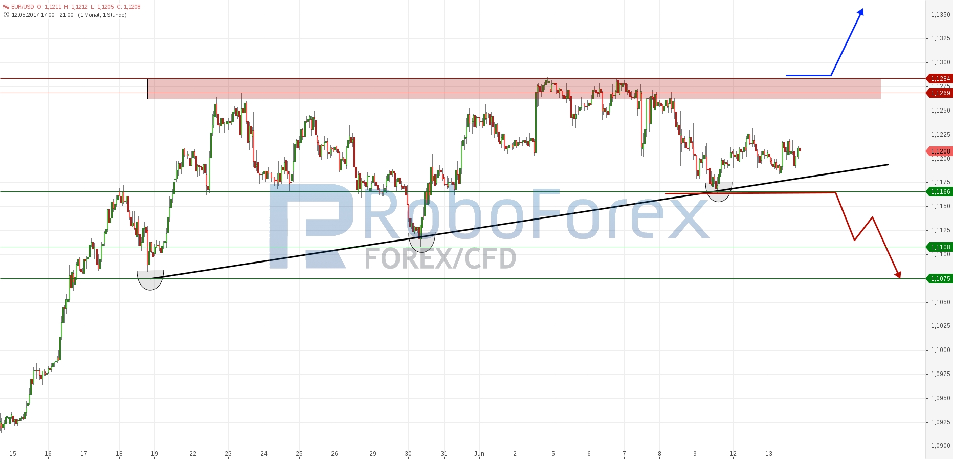 Im temporären Stundenchart hat das Währungspaar EUR/USD ein aufsteigendes Dreieck ausgebildet. Dies ergibt sich aus dem konstanten Widerstandsbereich zwischen 1,1270 USD und 1,1285 USD auf der Oberseite und den ansteigenden Korrekturtiefs (1,1075 USD, 1,1110 USD und 1,1166 USD) auf der Unterseite.
