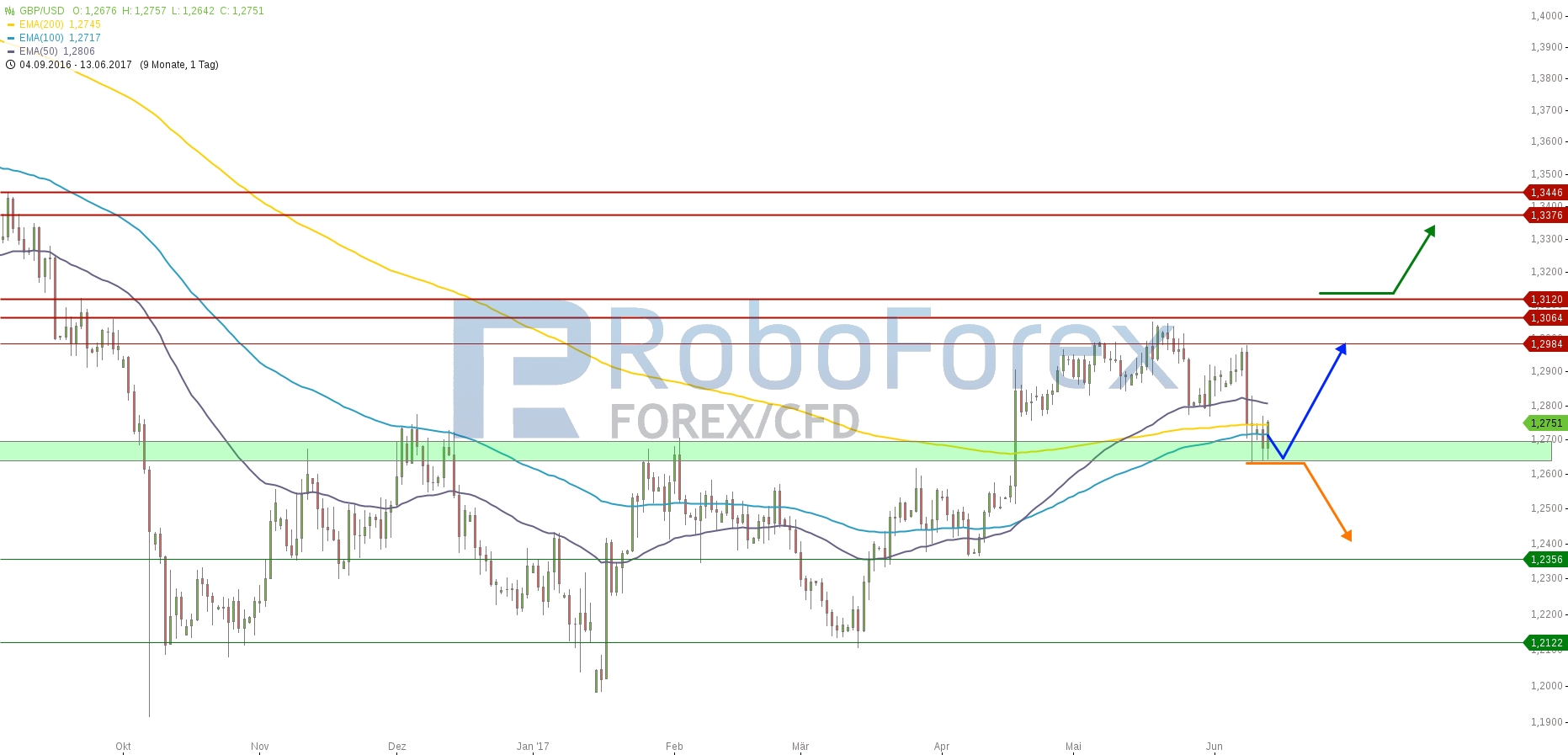 Der Cable kam im Zuge der Wahlen in Großbritannien wieder stärker unter Druck und fiel zurück in den Bereich um 1,2645 USD. Dort konnte sich GBP/USD allerdings vorerst stabilisieren und einen Rücksetzer unter den übergeordneten Unterstützungsbereich vermeiden. Allerdings notiert das Währungspaar wieder unterhalb der wichtigsten exponentiellen Durchschnittslinien, wodurch ein technisches Verkaufssignal generiert wurde.