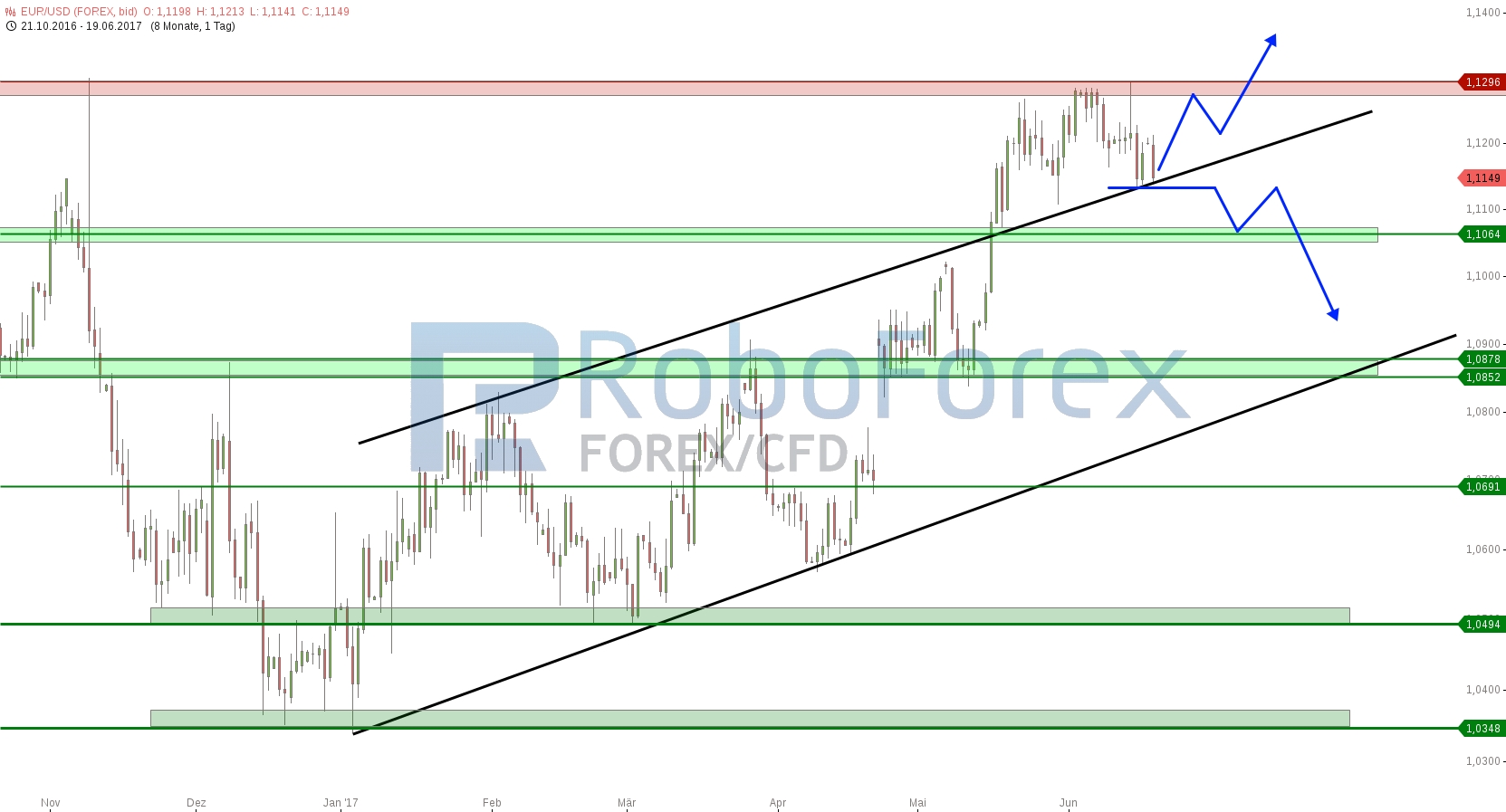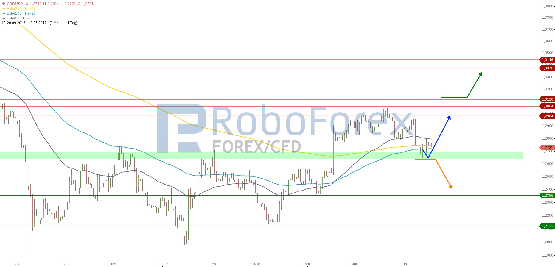 Damit stehen die Chancen für eine weitere Zinsanhebung in 2017 nach wie vor gut, weshalb der US-Dollar in den ersten Stunden nach der Notenbanksitzung deutlich zulegen konnte. Im Vorfeld wurde auf der Unterseite noch die temporäre Abwärtstrendlinie getestet.