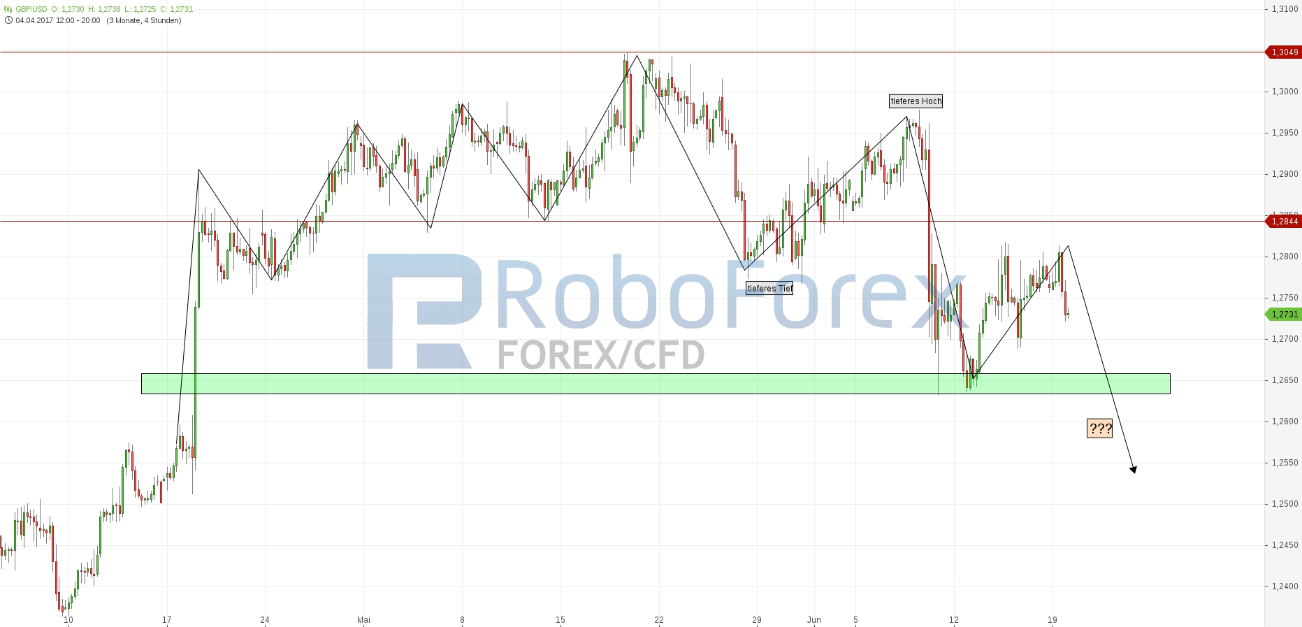 Hierfür spricht unter anderem die Trendwende im H4-Chart sowie der dortige intakte Abwärtstrend. Wer auf eine neue bullishe Impulsbewegung beim GBP/USD setzen will, sollte hier zunächst eine erneute Trendwende zum Aufwärtstrend abwarten.
