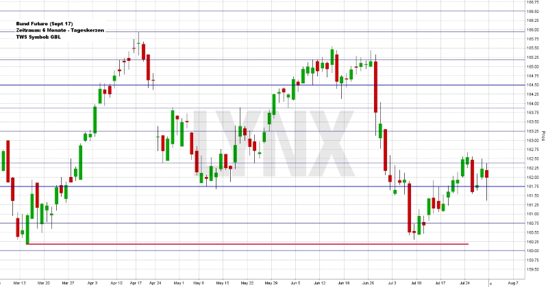 Wie angenommen präsentierte sich die Unterstützung 161,75 im Bund-Future als richtungsentscheidende Marke und Käufe in diesem Bereich erwiesen sich als gewinnbringend. Am Dienstag, Mittwoch und Freitag prallte der Markt gleich mehrfach von diesem Bereich nach oben ab. Der Schlusskurs zum Freitagabend lag im Bereich der 162,00 Punkte und somit rund 50 Ticks niedriger als in der Vorwoche. Die Bewegung am Dienstag der Vorwoche zeigte, dass sich aus einem leichten Überhang an Verkäufen schnell ein Momentum entwickeln kann. Diese Beobachtung sollte in der kommenden Handelswoche definitiv in Tradeüberlegungen einbezogen werden. Ein erneutes Absacken des Bund-Future unter die 161,75-Punkte-Marke käme also Shortüberlegungen zugute. Dabei könnten die Marken 161,00 und folgend 160,75 Punkte als realistische Ziele dienen. Kurse oberhalb der 161,75 Punkte wären weiterhin eher longtendierend und neue Bewegungshochs in Richtung 162,75 Punkte dann denkbar.