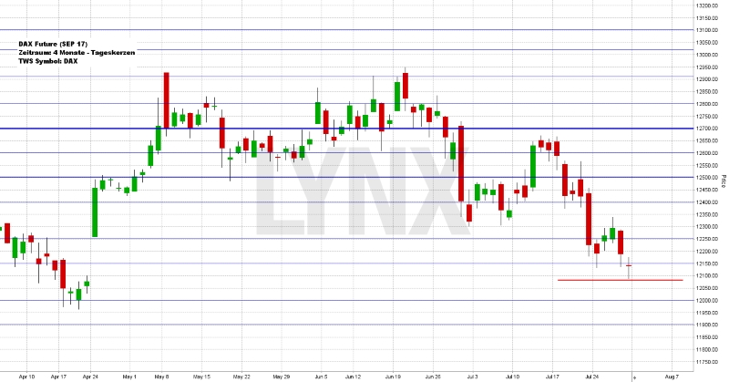 Der Deutsche Aktienindex schloss am Freitag via Xetra mit einem Minus von 0,40 Prozent bei 12.162,70 Punkten. Das Handelsvolumen lag bei 4,002 Mrd. Euro. Der XDAX notierte um 22:15 Uhr mit 12.180,00 Punkten und der FDAX notierte zum Handelsschluss an der EUREX mit 12.172,00 Punkten. Der Dow Jones beendete die Börsenwoche mit 21.830,31 Punkten, die neue Rekordmarke liegt bei 21.841,18 Punkten. Der NASDAQ 100 notierte zum Handelsschluss bei 5.908,92 Punkten, der Rekord beträgt 5.995,77 Punkte. Der breit gefasste S&P 500 schloss mit 2.472,10 Punkten, der Rekord liegt bei 2.484,04 Punkten. Der Euro notierte nach US-Börsenschluss bei 1,1751 US-Dollar und eine Feinunze Gold war am Spotmarkt für 1.269,64 US-Dollar zu haben, Rohöl der Nordseesorte Brent kostete zum US-Handelsschluss im September-Kontrakt 52,52 US-Dollar das Fass. Der Euro-Bund-Future schloss am Donnerstag an der EUREX mit 162,03 Punkten. Die Rendite für zehnjährige Bundesanleihen liegt aktuell bei 0,54 Prozent. Der Spread zwischen zehnjährigen deutschen Bunds und zehnjährigen US-Staatsanleihen (2,29 Prozent Rendite) liegt derzeit bei 175 Basispunkten. Am Dienstag der neuen Handelswoche plant die Finanzagentur des Bundes eine Auktion von Kapitalmarktinstrumenten (Schatz) mit zweijähriger Laufzeit. Die mit einem Volumen von 4,0 Mrd. EUR avisierte Auktion ist eine Aufstockung. Am darauffolgenden Mittwoch steht eine Auktion von Kapitalmarktinstrumenten (Bund) mit zehnjähriger Laufzeit und einem Volumen von 3,0 Mrd. an. Auch hier handelt es sich um eine Aufstockung.