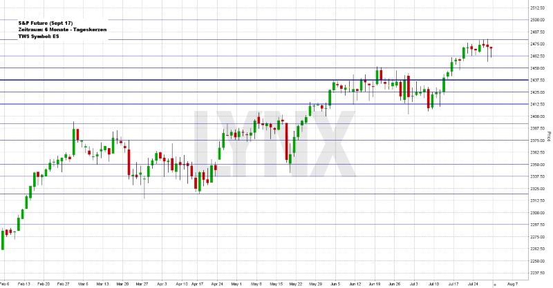 Der S&P-Future konnte sich in der vergangenen Handelswoche nicht nennenswert bewegen. Wie angenommen wurde die Aufwärtsreise durch die europäischen Indizes etwas gebremst und es wurden lediglich sehr vorsichtige Käufe getätigt. Dennoch konnten mehrfach neue Allzeithochs minimal ausgebaut werden, welche jedoch sehr schnell wieder abverkauft wurden. Der Schlusskurs zum Freitagabend lag im Bereich knapp über 2.470,00 Zählern und blieb damit nahezu auf dem gleichen Level wie in der Vorwoche. Neben den Bewegungen des S&P-Future sollten auch die aktuell recht schwachen europäischen Märkte im Blick behalten werden. Ohne ein Steigen dieser Märkte sollte auch der S&P-Future nicht nennenswert weiter steigen können. Eher könnte eine leichte Konsolidierung einsetzen, die den Markt durchaus in Richtung 2.437,50 führen könnte. Ein etwas defensiveres Handeln ist zu empfehlen.