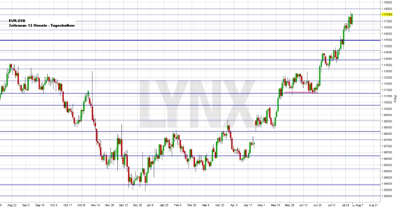 Auch in den vergangenen Handelstagen konnte der EUR/USD weiter aufwärts klettern und schaffte im Laufe der vergangenen Woche das Überschreiten der Jahreshochs von 2015. Euro-Käufe nach leichten Rücksetzern waren somit wie erwartet eine gute Wahl. Zum Wochenschluss zeigte sich das Währungspaar erneut stark und stand nahe der aktuellen Bewegungshochs im Bereich 1,1750. Mit dem Sprung des Marktes über den Widerstand 1,1725 und dem beständigen Halten dieser Höhen könnte auch in den kommenden Handelstagen der Weg nach oben frei sein. Etwas langfristiger gesehen ist aus charttechnischer Sicht der Weg bis hinauf zur 1,2500 ohne nennenswerte Widerstände. Bis auf Weiteres könnte somit an Käufe gedacht werden. Wie auch in den letzten Handelswochen sollten leichte Rücksetzer an Unterstützungen eine gute Wahl für Einstiege sein.