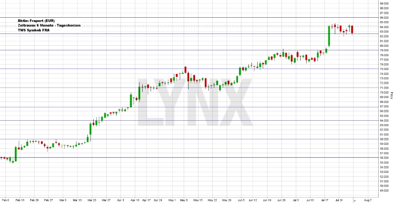 Die Aktie der Fraport AG konnte sich in den letzten Monaten sehr gut aufwärts bewegen. Sie wanderte aus dem Bereich um die Marke von 56,00 Euro hinauf bis kurz vor 85,00 Euro. Charttechnisch normale, leichte Konsolidierungen waren kaum vorhanden, was ein ideales Hantieren mit Stopps ermöglichte. In den letzten Tagen baute sich eine kleine Seitwärtsbewegung von 82,00 bis knapp 85,00 Euro auf und der Schlusskurs zum Freitagabend lag nahe der unteren Seitwärtszonengrenze im Bereich 82,50 Euro. Oberhalb von 82,00 Euro sollte weiterhin auf die Longseite geschaut werden, ein Ausbruch in Richtung neuer Hochs gilt als recht realistisch. Auch ein Absacken bis zur Unterstützung von rund 79,00 Euro ist charttechnisch ebenfalls noch Long und Käufe könnten ein interessantes Potenzial bieten. Erst ein Absacken unter 78,00 Euro beziehungsweise unter 76,00 Euro würde den Aufwärtstrend etwas ausbremsen. Eine erneute Analyse ist in diesem Fall anzuraten.