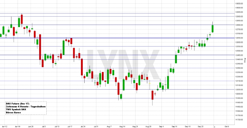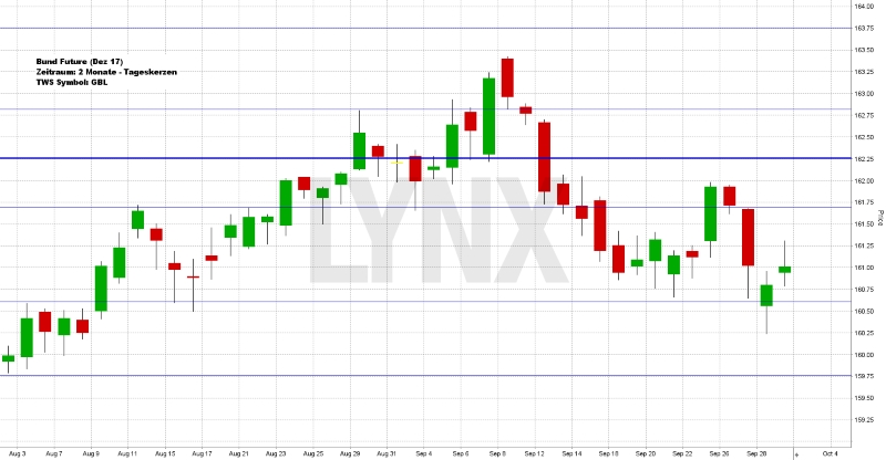 Der Deutsche Aktienindex beendete den Xetra-Handel am Freitag mit einem Plus von 0,98 Prozent bei 12.828,86 Punkten. Das Handelsvolumen lag bei 4,643 Mrd. Euro. Der XDAX notierte um 22:15 Uhr mit 12.840,39 Punkten und der FDAX schloss an der EUREX mit 12.829,50 Punkten. Der Dow Jones beendete den Handelstag mit 22.405,09 Punkten – die Rekordmarke liegt bei 22.419,51 Punkten. Der NASDAQ 100 notierte zum Handelsschluss bei 5.979,30 Punkten, der Rekordstand vom Mittwoch beträgt 6.012,95 Punkte. Der breit gefasste S&P 500 schloss mit 2.519,36 Punkten, der neue Rekord beträgt 2.519,44 Punkte. Der Euro notierte nach US-Börsenschluss bei 1,1814 US-Dollar. Eine Feinunze Gold war am Spotmarkt für 1.279,75 US-Dollar zu haben, Rohöl der Nordseesorte Brent kostete zum US-Handelsschluss im November-Kontrakt 56,79 US-Dollar das Fass. Der Euro-Bund-Future schloss am Freitag an der EUREX mit 161,00 Zählern. Die Rendite für zehnjährige Bundesanleihen liegt aktuell bei 0,46 Prozent. Der Spread zwischen zehnjährigen deutschen Bunds und zehnjährigen US-Staatsanleihen (2,33 Prozent Rendite) liegt derzeit bei 187 Basispunkten. In der neuen Handelswoche plant die Finanzagentur des Bundes am Mittwoch, den 04.10.2017 eine Auktion von Kapitalmarktinstrumenten (Bund) mit zehnjähriger Laufzeit. Die mit einem Volumen von 3,0 Mrd. EUR avisierte Auktion ist eine Aufstockung.