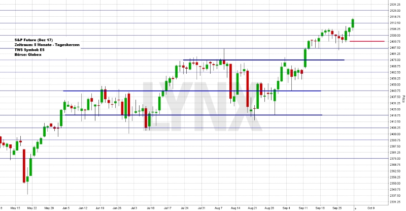 Die neue Handelswoche markiert neben einem Monatsanfang auch den Beginn des Schlussquartals 2017. Historisch betrachtet ein starkes Quartal. Gemäß den Experten von FactSet hat der S&P 500 in dieser Zeit seit 1950 im Durchschnitt 3,9 Prozent zugelegt. Die nächsten wichtigen Daten stehen den Börsianern mit den US-Arbeitsmarktdaten für den September am Freitag um 14:30 Uhr bevor.