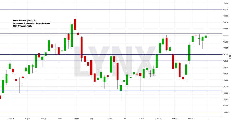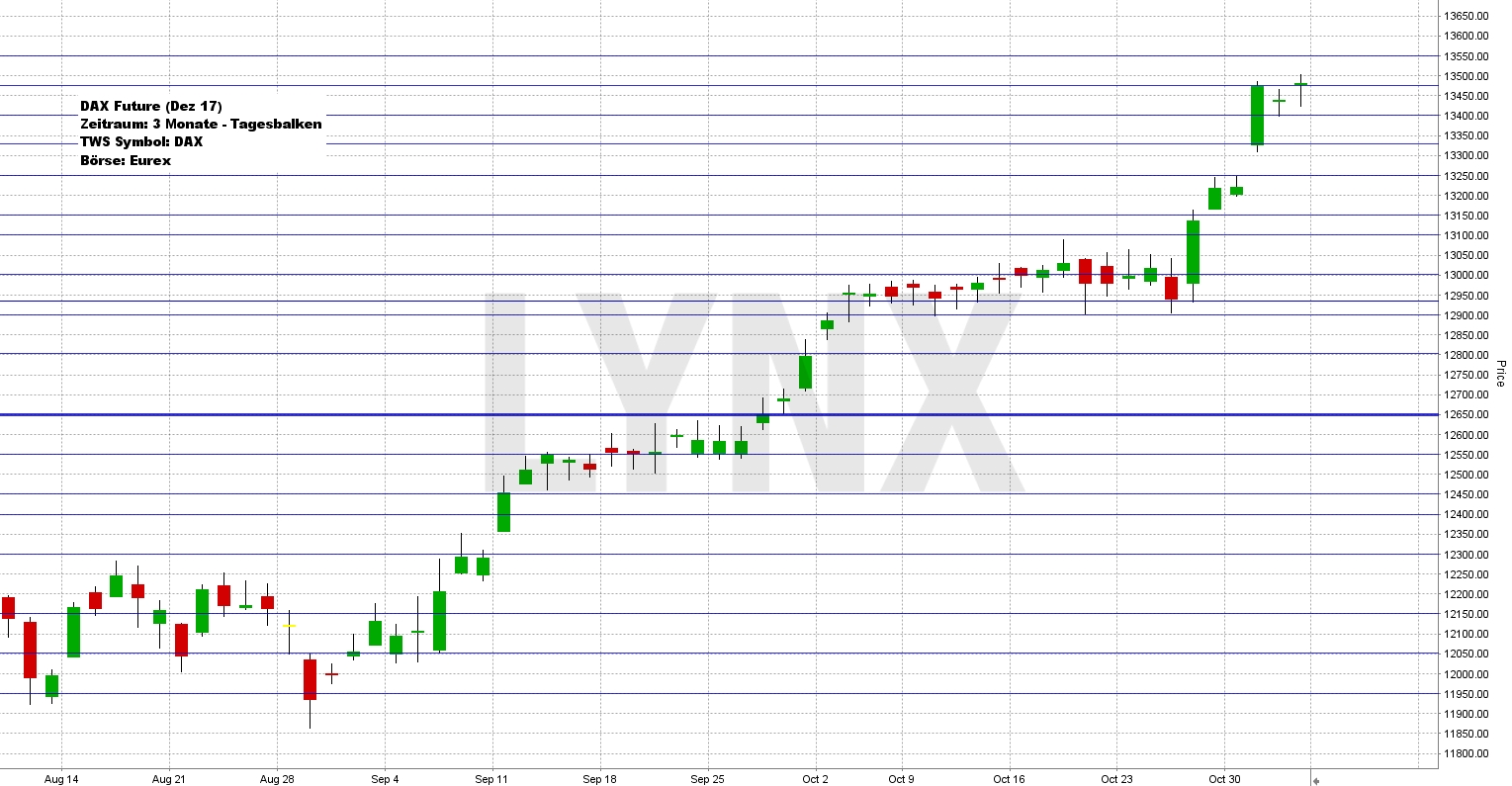Der Deutsche Aktienindex beendete den Xetra-Handel am Freitag mit einem Plus von 0,28 Prozent bei 13.478,86 Punkten, das neue Rekordhoch liegt jetzt bei 13.505,01 Punkten. Das Handelsvolumen lag bei 3,668 Mrd. Euro. Der XDAX notierte um 22:15 Uhr mit 13.473,52 Punkten und der FDAX schloss an der EUREX mit 13.470,00 Punkten. Der Dow Jones beendete den Handelstag mit 23.539,19 Punkten, die Rekordmarke liegt bei 23.557,06 Punkten. Der NASDAQ 100 notierte zum Handelsschluss bei 6.295,58 Punkten, der neue Rekordstand beträgt 6.297,62 Punkte. Der breit gefasste S&P 500 schloss mit 2.587,84 Punkten, der neue Rekord beträgt 2.588,42 Punkte. Der Euro notierte nach US-Börsenschluss bei 1,1608 US-Dollar. Eine Feinunze Gold war am Spotmarkt für 1.269,91 US-Dollar zu haben, Rohöl der Nordseesorte Brent kostete zum US-Handelsschluss im Januar-Kontrakt 62,07 US-Dollar das Fass. Der Euro-Bund-Future schloss am Freitag an der EUREX mit 162,81 Punkten. Die Rendite für zehnjährige Bundesanleihen liegt aktuell bei 0,36 Prozent. Der Spread zwischen zehnjährigen deutschen Bunds und zehnjährigen US-Staatsanleihen (2,33 Prozent Rendite) liegt derzeit bei 197 Basispunkten. In der neuen Handelswoche begibt die Finanzagentur des Bundes eine Auktion von Kapitalmarktinstrumenten (iBund) mit einem Emissionsvolumen von 0,5 Mrd. Euro und einer Laufzeit bis zum 15. April 2030. Es handelt sich um eine Aufstockung.