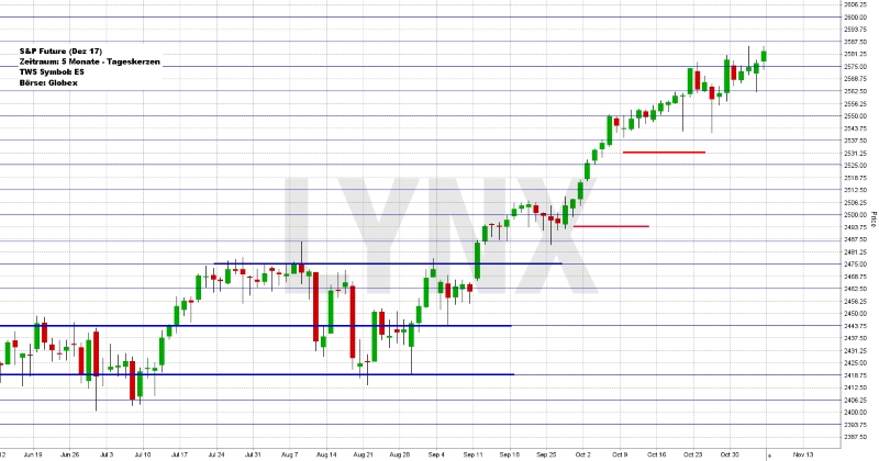 Zum Wochenstart legte der S&P vorerst leicht den Rückwärtsgang ein und sackte bis kurz vor die Unterstützung von 2.562,50 ab. Damit bot er die erste gute Möglichkeit für einen Kauf in Richtung neuer Allzeithochs. Nach dem Erreichen dieser Allzeithochs sackte der Markt erneut Richtung 2.562,50 ab und bot die zweite Möglichkeit eines nahezu perfekten Trades in Richtung der Hochs. Der Schlusskurs zum Freitagabend lag nahe der Hochs im Bereich 2.582,00. Der Markt sollte oberhalb von 2.562,50 Punkten weiterhin von der Longseite aus betrachtet werden. Aktuell spricht aus charttechnischer Sicht nichts gegen den vorherrschenden Aufwärtstrend. Es ist durchaus realistisch, von weiteren Allzeithochs auszugehen, wobei jedes neue Erreichen schnell wieder abverkauft wird. Unterhalb von 2.562,50 ist das Bild für die kurzfristige Aufwärtsseite etwas unsauberer, da ein leichter Schub in Richtung von 2.544,00 Punkten einsetzen könnte.