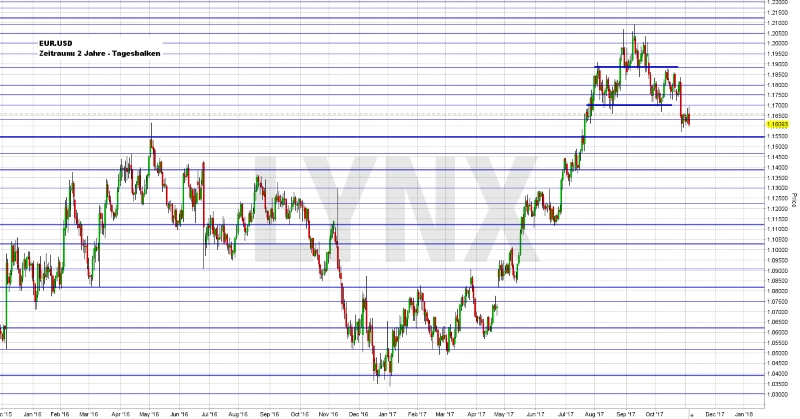 Die letzten fünf Handelstage des EUR.USD konnten das charttechnische Bild im Vergleich zur Vorwoche nur wenig verändern. Nennenswerte Bewegungen konnten nicht verzeichnet werden. Allerdings ergaben sich hin und wieder die angepeilten Chancen auf der Abwärtsseite und leichte Erholungen boten verschiedene Chancen für Verkäufe. Das Ziel 1,1550 wurde jedoch nicht erreicht, die am Freitag einsetzende Abwärtsbewegung tendierte allerdings bereits stark in diese Richtung. Der Schlusskurs am Freitagabend lag im Bereich 1,1600 und somit annähernd auf dem Niveau vom Freitag der Vorwoche. Jetzt sollte weiterhin auf die Abwärtsseite geachtet werden. Kurse unterhalb von 1,1700 bergen auch in den kommenden Handelstagen tendenziell die Chance, an die Unterstützung von 1,1550 zu laufen. Von dort aus könnte es zu einer leichten Erholung kommen, was gegebenenfalls mit Longtrades ausgenutzt werden könnte. Unter Beachtung der aktuellen Situation und des antizyklischen Herangehens, sollte jedoch das Risk- und Moneymanagement entsprechend angepasst werden.