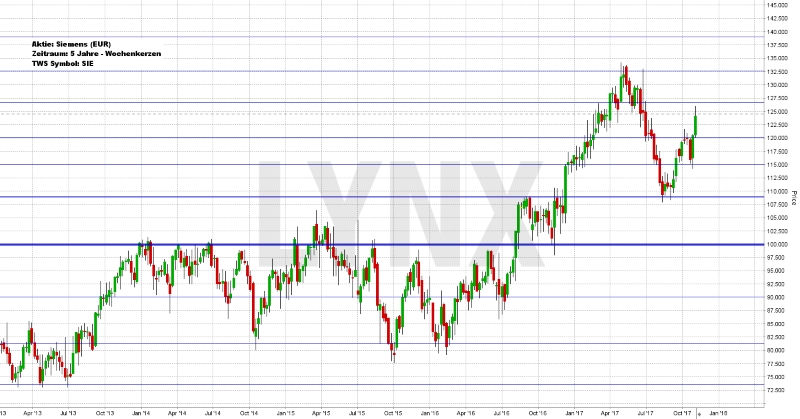 Seit Mitte 2013 konnte sich die Siemens-Aktie gut entwickeln. Die Kernbewegung fand aber erst Anfang 2016 ihren Startpunkt. Von rund 82,50 Euro ging die Reise bis auf gut 132,50 Euro und von dort wieder hinab auf 110,00 Euro. Von diesem Unterstützungstest konnte sich der Wert mittlerweile erholen und rangiert derzeit knapp vor der Marke von 125,00 Euro. Das schob die Jahresperformance des Wertes wieder in den positiven Bereich und brachte zugleich die Performance der letzten fünf Jahre auf rund 65 Prozent Plus. Die Chancen auf ein erneutes Erreichen der Hochs im Bereich 132,50 stehen charttechnisch nicht schlecht. Oberhalb von 116,00 Euro wären Kaufgedanken durchaus denkbar und aus trendfolgender Sicht mit einem interessanten Gewinnpotenzial behaftet. Leichte Rücksetzer an Unterstützungen könnten die besten Kaufgelegenheiten darstellen, aktuell käme hier gegebenenfalls der Bereich 121,00 in die engere Auswahl. Ein nachhaltiges Absacken unter den Kursbereich von 115,00 Euro wäre für die Aufwärtsseite jedoch leicht kontraproduktiv. In diesem Fall sollten Käufe mit Vorsicht angegangen beziehungsweise gegebenenfalls ganz ausgesetzt werden.