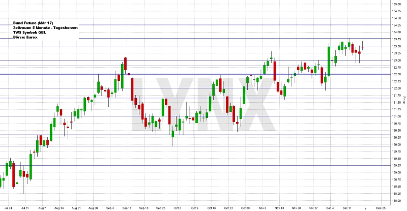Direkt am Montag der vergangenen Handelswoche konnte der Bund-Future ein neues Bewegungshoch ausbauen, bevor der Markt bis zur Kernunterstützung von 163,00 absackte. In diesem Bereich konnten mehrfach Käufe mit interessanten Gewinnmöglichkeiten eingegangen werden. Am Freitag konnte der Markt erneut einen Versuch in Richtung des Wochenhochs von 163,75 starten, scheiterte jedoch knapp und endete zum Handelsschluss im Bereich knapp unter der Marke von 163,50. Die Kernunterstützung von 163,00 Punkten sollte zunächst richtungsentscheidend bleiben. Kurse oberhalb dieser Marke wären somit weiterhin für die Käuferseite interessant und neue Bewegungshochs sind denkbar. Als realistisches Ziel bietet sich der Widerstand von 164,25 an. Die Volatilität könnte in den kommenden Tagen weiter rückläufig sein, was gegebenenfalls zu einem konservativerem Handel führen sollte. Shorttrades sind aus aktueller Sicht keine nennenswerte Option.