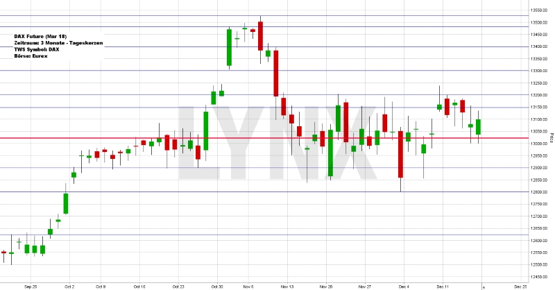 Der Deutsche Aktienindex beendete den Xetra-Handel am Freitag mit einem Plus von 0,27 Prozent bei 13.103,56 Punkten. Das Rekordhoch liegt bei 13.525,56 Punkten. Das Handelsvolumen betrug 8,472 Mrd. Euro. Der XDAX notierte um 22:15 Uhr mit 13.131,18 Punkten und der FDAX schloss an der EUREX mit 13.125,00 Punkten. Der Dow Jones beendete den Handel mit 24.651,74 Punkten und die Rekordmarke liegt bei 24.688,62 Punkten. Der NASDAQ 100 notierte zum Handelsschluss bei 6.466,32 Punkten und der Rekordstand beträgt 6.470,92 Punkte. Der breit gefasste S&P 500 schloss mit 2.675,81 Punkten und der Rekordstand liegt jetzt bei 2.679,63 Punkten. Der Euro notierte nach US-Börsenschluss bei 1,1749 US-Dollar. Eine Feinunze Gold war am Spotmarkt für 1.256,44 US-Dollar zu haben und Rohöl der Nordseesorte Brent kostete zum US-Handelsschluss im Februar-Kontrakt 63,23 US-Dollar das Fass. Der Euro-Bund-Future schloss am Freitag an der EUREX mit 163,57 Punkten. Die Rendite für zehnjährige Bundesanleihen liegt aktuell bei 0,30 Prozent. Der Spread zwischen zehnjährigen deutschen Bunds und zehnjährigen US-Staatsanleihen (2,35 Prozent Rendite) liegt derzeit bei 205 Basispunkten.