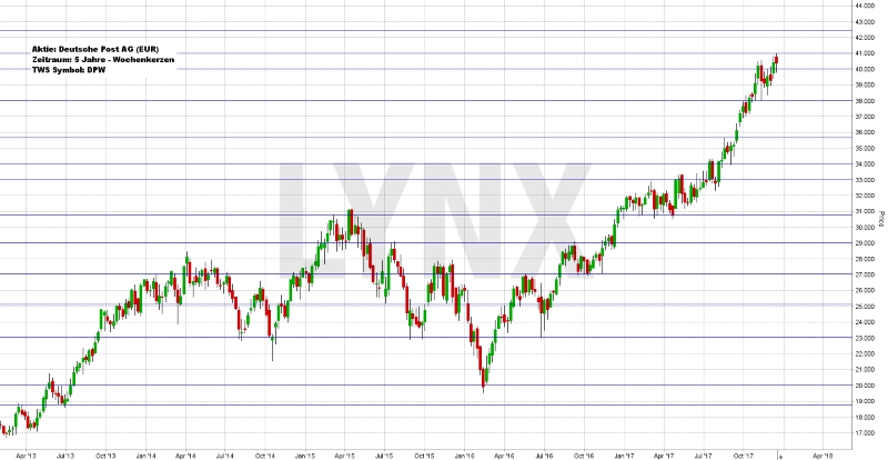 Der Aktie der Deutschen Post AG konnte sich in den vergangenen fünf Handelsjahren sehr gut entwickeln und ihren Wert mehr als verdoppeln. Von knapp 18,00 Euro ging es bis auf rund 41,00 Euro hinauf, wobei die Trendstärke in dieser Zeit doch recht unterschiedlich abzulesen ist. Gerade von April 2015 bis Anfang 2016 tendierte der Wert kurzzeitig eher abwärts und ermöglichte es, in einem Bereich einzusteigen, der dem Kurs von Anfang bis Mitte 2013 ähnelte. Danach setzte eine sehr saubere Aufwärtsbewegung ein, die es erlaubte, nach allen Regeln der Charttechnik Stops sauber nachzuziehen und trotzdem im Markt zu bleiben. Der aktuelle Schlusskurs liegt nahe dem Allzeithoch von 41,00 Euro. Aus einer kurzfristigeren Sicht sollte der Wert oberhalb von 38,00 Euro weiterhin klar aufwärtsgerichtet sein und weitere Käufe oder auch das Halten von Longpositionen wären daraus resultierende Handlungen. Das Erreichen neuer Allzeithochs in Richtung 42,50 Euro könnte durchaus als realistisches Ziel gewertet werden. Aus längerfristiger Sicht wären auch Kurse unterhalb von 38,00 Euro noch sauber im Aufwärtstrend und Käufe wären ebenfalls denkbar. Erst ein Absacken unter die Unterstützung von 35,00 Euro würde eine neue Analyse nach sich ziehen, da sich dann unter Umständen ein Abwärtstrend ausbildet und Käufe keinen gewinnbringenden Vorteil mehr hätten.