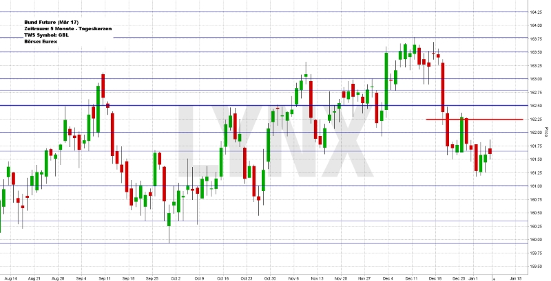 Der Beginn des Handelsjahres 2018 brachte im Bund-Future wie angenommen keine nennenswerten Bewegungen und die eher unsaubere Chartbewegung setzte sich fort. Am Dienstag setzte eine leichte Abwärtsbewegung in Richtung 161,25 ein, die in den folgenden Tagen bis Freitag nahezu zurückerobert werden konnte. Der Schlusskurs der ersten Handelswoche des Jahres 2018 lag fast auf dem gleichen Niveau des Schlusskurses der Vorwoche. Auch in den nächsten Handelstagen sollte sich die charttechnisch unsaubere Situation wenig verändern. Unterhalb von 162,25 könnte gegebenenfalls ein leichter Vorteil auf der Abwärtsseite liegen, wobei zahlreiche Unterstützungsbereiche des vergangenen Handelsjahres eine saubere Bewegung eher bremsen als beschleunigen könnten. Für die Aufwärtsseite wird es interessant, sobald es der Markt dauerhaft über den Widerstand von 162,50 schafft. Ab diesem Niveau wird das charttechnische Bild sauberer und Käufe wären denkbar. Gegebenenfalls sollte in diesem Fall allerdings eine neue Analyse erstellt werden.