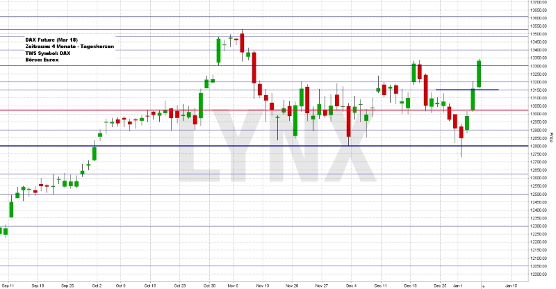 Die erste Handelswoche des neuen Jahres brachte dem Deutschen Aktienindex DAX nach dem stärkeren Kurseinbruch am ersten Handelstag eine breite Erholung. Insgesamt konnte der DAX vom Tief bei 12.745,15 Punkten bis zum Zwischenhoch von 13,332,80 Punkten mit rund 588 Punkten Aufwärtstrecke wieder Boden gutmachen. Damit notiert er wieder auf Vorweihnachtsniveau. Die Wall Street gab dem DAX dabei Schützenhilfe. Die drei US-Leitindizes Dow Jones, NASDAQ 100 und S&P 500 brachen in der abgelaufenen Handelswoche gleich mehrfach ihre alten Bestmarken. Der Dow Jones stellte noch einen weiteren Rekord auf, indem er die schnellste 1.000-Punkte-Aufwärtsstrecke zurücklegte.