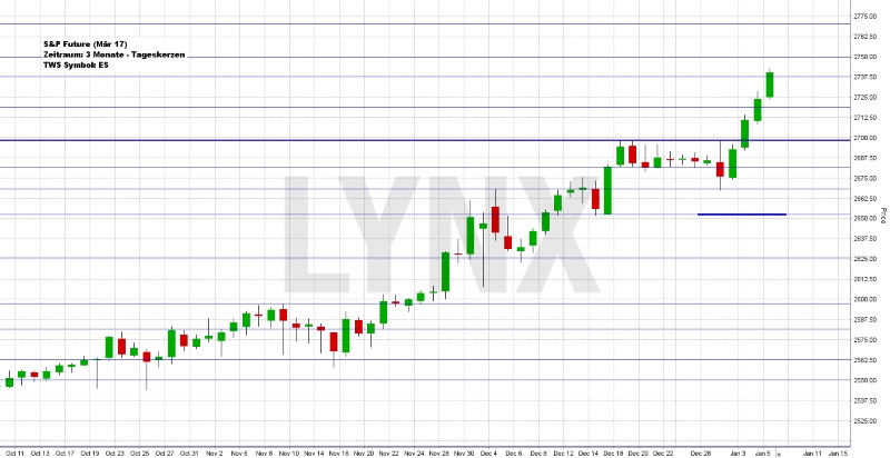 Mit einer fulminanten Aufwärtbewegung konnte der S&P-Future in das Jahr 2018 starten und baute am Mittwoch, Donnerstag und Freitag jeweils neue Allzeithochs aus. Mit diesem Raketenstart konnte die Marke von rund 2.740,00 als ein neues Allzeithoch markiert werden, das rund 40 Punkte höher lag als das Allzeit- und Jahreshoch aus 2017. Nennenswerte Rücksetzer konnten am S&P in den vergangenen Tagen nicht beobachtet werden. Die Kerntendenz sollte auch in den kommenden Handelstagen aufwärts gerichtet bleiben, wobei es nicht verwunderlich wäre, wenn sich eine leichte Korrektur in Richtung 2.720,00 beziehungsweise 2.700,00 einstellt. Diese Bereiche stellen Kernunterstützungen dar und wären gegebenenfalls definitiv Bereiche für Kaufüberlegungen. Aus Sicht des laufenden Aufwärtstrends sind Verkäufe weniger interessant.