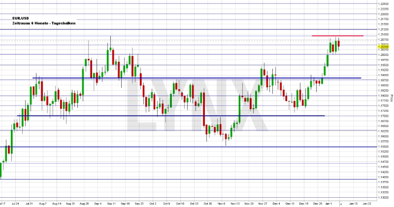 Der EUR.USD erreichte annähernd das gesetzte Wochenziel von 1,2100, die Kraft für ein Überschreiten fehlte jedoch an mehreren Tagen. Mehrfach war zu beobachten, dass sich die 1,2000-Punkte-Marke als die wichtigste Wochenunterstützung präsentierte. Der Schlusskurs am Freitagabend lag knapp unter 1,2050. Die seit Mitte Dezember anhaltende Aufwärtsbewegung hat aus charttechnischer Sicht auch in der bevorstehenden Handelswoche bestand. Kurse oberhalb von 1,2000 beziehungsweise oberhalb der Unterstützung von 1,1950 könnten somit für Käufe genutzt werden. Ein Durchbruch durch den Widerstand von 1,2100 und das folgende Erreichen der Marke von 1,2130 ist durchaus als realistisch zu werten. Shorttrades sind aus aktueller Sicht vorerst weniger interessant und allenfalls bei merklichem Abwärtsmomentum sinnvoll.