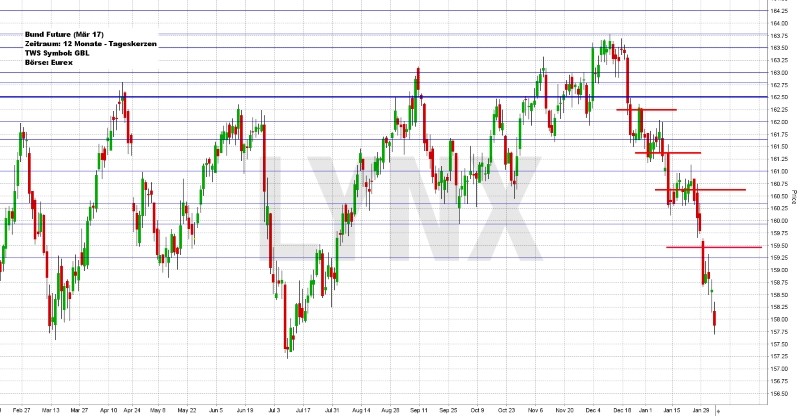Der Bund-Future bewegte sich erwartet erneut in die angenommene Abwärtsrichtung bewegen und durchstieß mit Leichtigkeit die angesprochenen Ziele gen Süden. Das Wochentief fand der Markt im Bereich 157,75, was eine Wochenbewegung von rund 200 Ticks bedeutete. Mehrere kleine Rücksetzer boten teilweise ideale Einstiegsszenarien. Der Schlusskurs vom Freitagabend lag im Bereich 157,85 Punkten und somit nahe des aktuellen Bewegungstiefs. Auch in den kommenden Handelstagen sollte die Abwärtsseite eine wesentliche Rolle für Handlungen spielen und weitere Verkaufsgedanken in Richtung des Tiefs von Mitte 2017 im Kursbereich von 157,20 sind denkbar. Selbst eine leichte Erholung bis hinauf auf 159,50 Punkte käme dem derzeitigen grundsätzlichen Shortvorteil nicht unbedingt in die Quere. Erst ein dauerhaftes Überschreiten dieses Bereichs wäre für die Abwärtsseite etwas kontraproduktiv, was zu einer vorläufigen Zurückhaltung bein Verkäufe führen sollte. Käufe sind aus aktueller Sicht eher weniger interessant und würden wenn überhaupt als sehr aggressiv eingestuft werden müssen.