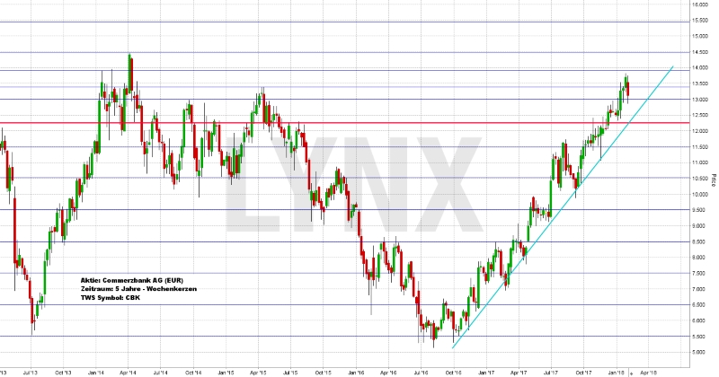 Die Aktie der Commerzbank AG bewegte sich in den vergangenen fünf Handelsjahren ohne einen nennenswerten Trendvorteil zwischen den Marken 14,00 Euro und 5,50 Euro hin und her und zeigte zwischenzeitlich interessante Trends auf der Aufwärts- wie auch Abwärtsseite. Lediglich von Januar 2014 bis April 2015 konnte sich der Wert nur schwer für eine ausnutzbare Richtung entscheiden, was zu einer engen Seitwärtsrange zwischen den Marken 14,00 Euro und 10,50 Euro führte. Seit Oktober 2016 befindet sich der Wert erneut in einem sauberen Aufwärtstrend, der im Bereich von rund 5,50 Euro startete und sein aktuelles Bewegungshoch nur knapp unter der 14-Euro-Marke fand. Der aktuelle Schlusskurs der letzten Handelswoche lag etwas über der Marke von 13,00 Euro und damit auch nur knapp unter dem aktuellen Bewegungshoch. Kurse oberhalb der eingezeichneten Trendlinie und oberhalb der Unterstützung von 12,25 Euro könnten somit in den kommenden Handelswochen dafür sorgen, dass der aktuelle Aufwärtstrend fortgesetzt wird. Das Erreichen neuer Hochs über der Marke von 14,50 Euro wäre generell denkbar und auch das Erreichen des nächsten Widerstands ist nicht auszuschließen. Sollte der Wert jedoch dauerhaft unter die Marke von 12,50 Euro sinken, wäre eine etwas stärkere Konsolidierung, die den Bereich von 10,50 Euro anlaufen könnte, ebenfalls denkbar.