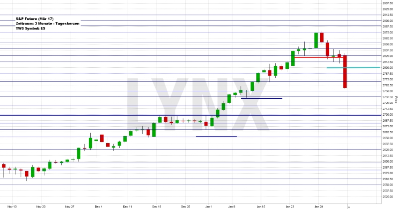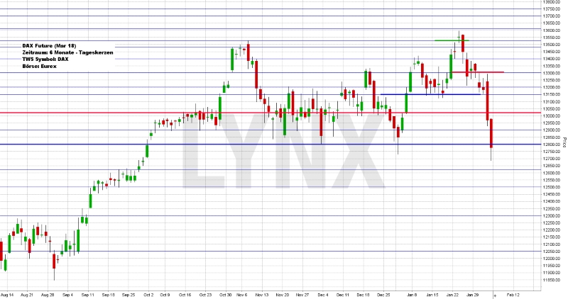 Der Deutsche Aktienindex beendete den Xetra-Handel am Freitag mit einem Minus von 1,68 Prozent bei 12.785,16 Punkten. Das Rekordhoch liegt bei 13.596,89 Punkten. Das Handelsvolumen betrug 5,402 Mrd. Euro. Der XDAX notierte um 22:15 Uhr mit 12.696,64 Punkten und der FDAX schloss an der EUREX mit 12.688,00 Punkten. Der Dow Jones beendete den Handel mit 25.520,96 Punkten und die Rekordmarke liegt bei 26.616,71 Punkten. Der NASDAQ 100 notierte zum Handelsschluss bei 6.760,29 Punkten und der Rekordstand beträgt 7.022,97 Punkte. Der breit gefasste S&P 500 schloss mit 2.762,13 Punkten und der Rekordstand liegt bei 2.872,87 Punkten. Der Euro notierte nach US-Börsenschluss bei 1,2463 US-Dollar. Eine Feinunze Gold war am Spotmarkt für 1.333,39 US-Dollar zu haben und Rohöl der Nordseesorte Brent kostete zum US-Handelsschluss im April-Kontrakt 68,58 US-Dollar das Fass. Der Euro-Bund-Future schloss am Freitag an der EUREX mit 157,96 Punkten. Die Rendite für zehnjährige Bundesanleihen liegt aktuell bei 0,76 Prozent. Der Spread zwischen zehnjährigen deutschen Bunds und zehnjährigen US-Staatsanleihen (2,84 Prozent Rendite) liegt derzeit bei 208 Basispunkten. Die Bundesfinanzagentur emittiert am Mittwoch, den 07. Februar 2018 Kapitalmarktinstrumente (Bund) mit einer zehnjährigen Laufzeit und mit einem Volumen von 3,0 Mrd. EUR. Es handelt sich um eine Aufstockung.