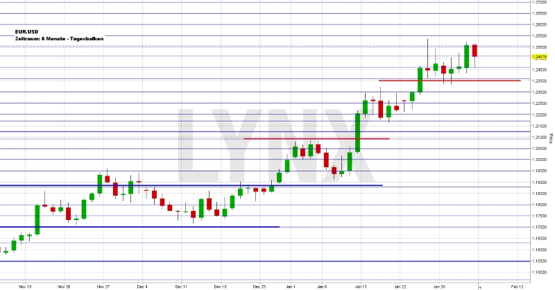 Etwas verhalten startete der EUR.USD am vergangenen Montag in die Handelswoche und testete bis zum Dienstag mehrfach den erwähnten Unterstützungsbereich bei rund 1,2350 Zählern. Bis zum Donnerstagabend setzte dann eine leichte trendfolgende Bewegung in Richtung der Bewegungshochs von knapp 1,2550 ein, bevor es am Freitag erneut tendenziell abwärts ging und ein Wochenschlusskurs im Unterstützungsniveau von circa 1,2450 gefunden werden konnte. Alles in allem eine leicht positive Handelswoche, ohne jedoch neue Bewegungshochs ausbauen zu können. Ähnlich wie der Vorwochenanalyse sollte weiterhin der Bereich von 1,2350 als Kernunterstützung für eine Fortsetzung des generellen Aufwärtstrends im Fokus bleiben. Kurse darüber könnten somit gegebenenfalls zu vorsichtigen Kaufgedanken Anlass geben, jedoch sollte weiterhin berücksichtigt werden, dass auf einer höheren Zeitebene nicht zu unterschätzende Widerstände nahe der Bewegungshochs von Ende Januar warten. Es wäre ebenfalls denkbar, dass sich nach einem nachhaltigen Unterschreiten des Unterstützungsniveaus von 1,2350 eine leichte Korrekturphase einstellt, die eventuell ebenfalls Chancen bieten könnte. Ein Erreichen des Unterstützungsniveaus von 1,2250 ist gegebenenfalls als realistisch zu werten.