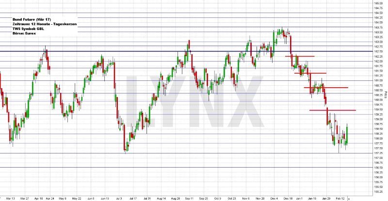 Der Bund-Future tendierte in der vergangenen Handelswoche hauptsächlich seitwärts. Es konnten weder neue Bewegungstiefs ausgebaut, noch konnte der erwähnte wichtige Widerstandsbereich von 158,75 Punkten nach oben durchstoßen werden. Auffallend war jedoch die eindeutig aufwärts gerichtete Bewegung am Freitag. Aus dem Bereich 157,75 ging es in einem Zug hinauf auf das Wochenhoch von 158,75 Punkten und auch der Wochenschlusskurs lag nicht wesentlich tiefer. Das Vorwochenhoch von 158,75 sollte für die kommende Handelswoche die richtungsentscheidende Marke darstellen. Schafft es der Bund-Future über diesen Widerstand, wäre ein weiteres Erholungspotenzial denkbar, das sich vorerst bis in den Bereich 159,50 erstrecken könnte. Kurse unterhalb von 158,75 Punkten wäre jedoch erneut leicht abwärtstendierend und ein Ziel wie 157,25 und folgend auch 158,50 durchaus denkbar.