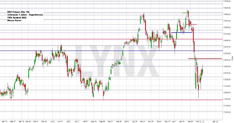 Der Deutsche Aktienindex beendete den Xetra-Handel am Freitag mit einem Plus von 0,86 Prozent bei 12.451,96 Punkten. Das Rekordhoch liegt bei 13.596,89 Punkten. Das Handelsvolumen betrug 4,572 Mrd. Euro. Der XDAX notierte um 22:15 Uhr mit 12.486,28 Punkten und der FDAX schloss an der EUREX mit 12.479,00 Punkten. Der Dow Jones beendete den Handel mit 25.219,38 Punkten und die Rekordmarke liegt bei 26.616,71 Punkten. Der NASDAQ 100 notierte zum Handelsschluss bei 6.770,66 Punkten und der Rekordstand beträgt 7.022,97 Punkte. Der breit gefasste S&P 500 schloss mit 2.732,22 Punkten und der Rekordstand liegt bei 2.872,87 Punkten. Der Euro notierte nach US-Börsenschluss bei 1,2406 US-Dollar. Eine Feinunze Gold war am Spotmarkt für 1.346,95 US-Dollar zu haben und Rohöl der Nordseesorte Brent kostete zum US-Handelsschluss im April-Kontrakt 64,84 US-Dollar das Fass. Der Euro-Bund-Future schloss am Freitag an der EUREX mit 158,47 Punkten. Die Rendite für zehnjährige Bundesanleihen liegt aktuell bei 0,70 Prozent. Der Spread zwischen zehnjährigen deutschen Bunds und zehnjährigen US-Staatsanleihen (2,87 Prozent Rendite) liegt derzeit bei 217 Basispunkten. Die Bundesfinanzagentur emittiert am Dienstag im Rahmen einer Neuemission Kapitalmarktinstrumente (Schatz) mit einer zweijährigen Laufzeit und mit einem Volumen von 5,0 Mrd. EUR.
