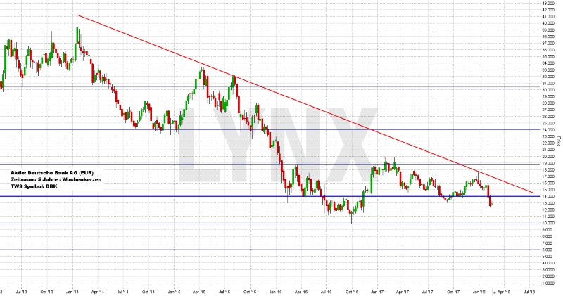 Die Performance der Deutschen-Bank-Aktie konnte in den letzten fünf Jahren wenig überzeugen. Aus dem Kursbereich von gut 30,00 Euro kommend, sackte der Wert in mehreren Schritten bis auf rund 10,00 Euro ab. Zwischenzeitliche leichte Erholungsphasen waren charttechnisch lediglich als normale Erholungen im Abwärtstrend zu werten und fallende Trendbewegungen setzten immer wieder recht schnell ein. Seit Januar 2018 tendiert der Wert erneut abwärts und rutschte aus dem Kursbereich von rund 17,00 Euro auf unter 13,00 Euro ab. Das aktuell wichtige Unterstützungsniveau von rund 14,00 Euro wurde damit gebrochen. Aus charttechnischer Sicht stehen auch für die kommenden Handelswochen die Vorzeichen der Deutschen Bank Aktie mehr auf Short als auf Long. Das Erreichen des Tiefs aus 2016 im Kursbereich von 10,00 Euro könnte durchaus als realistisch gewertet werden. Generell wären Kurse unterhalb von 14,00 Euro und auch unterhalb der eingezeichneten Trendlinie potenzielle Abwärtskanditaten. Erst ein nachhaltiger Sprung über die Trendlinie könnte eventuell Hoffnungen auf eine Wende des Trends entfachen, eine erneute situationsbezogene Analyse wäre jedoch vor Käufen anzuraten. Prinzipiell könnte der Bereich der Marke von 22,50 Euro ein realistisches Ziel sein.