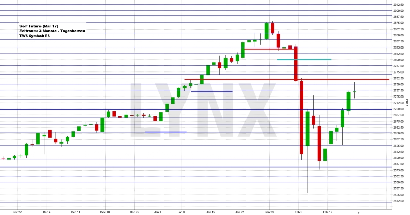Wie angenommen war die derzeit erhöhte Volatilität des S&P Futures auch in der letzten Handelswoche zu spüren und so zeigte der Markt eine Wochenschwankung von rund 125 Punkten. Die angenommene Abwärtstendenz war jedoch nur bedingt umsetzbar und spätestens ab Mittwoch, mit dem Überschreiten des wichtigen Widerstands von 2.700,00 Punkten, waren dann sogar nachhaltige Käufe möglich. Der Wochenschluss lag im Bereich 2.735,00 und somit rund 120 Punkte höher als der vorangegangene Wochenschlusskurs. Jetzt wird für den S&P interessant, wie der Markt mit dem Widerstand um die Marke von 2.760,00 Punkten umgeht, der nur knapp oberhalb des letzten Wochenhochs liegt. Sollte ein nachhaltiger Bruch möglich sein, wären auch weiterhin steigende Kurse denkbar. Unterhalb könnte es gegebenenfalls zu einer leichten Konsolidierung kommen, die den Markt in Richtung 2.700,00 drücken könnte. Unterhalb von 2.700,00 Zählern wäre die Abwärtsseite erneut interessant, oberhalb dieses Unterstützungsniveaus vorsichtig weiterhin die Aufwärtsseite.