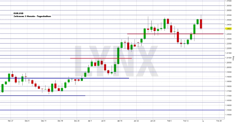 Der EUR.USD konnte sich aus dem in der Vorwoche genannten Unterstützungsniveau von 1,2250 vorerst in Richtung des wichtigen Widerstandsbereichs von 1,2350 vorarbeiten, um folgend nach einer leichten Korrektur bis auf das Niveau der Hochs von Ende Januar anzusteigen. Von dort setzte am Freitag erneut eine etwas stärkere Korrektur ein, die zum Freitagabend zu einem Schlusskurs von rund 1,2400 Zählern führte. Das Jahreshoch von Ende Januar konnte in diesem Zuge kurzzeitig überschritten werden. Auch in den kommenden Handelstagen sollte die Unterstützung von 1,2350 die richtungsentscheidende Marke sein. Kurse darüber wären somit weiterhin interessant und könnten Longüberlegungen zulassen. Das erneute Erreichen des 1,2550-Punkte-Bereichs ist realistisch einzustufen. Auch neue Jahreshochs sind nicht auszuschließen, wobei oberhalb von 1,2600 diverse Widerstände aus übergeordneten Zeiteinheiten warten. Unterhalb von 1,2350 bekäme die Abwärtsseite erneut einen leichten Trendvorteil und Verkäufe in Richtung 1,2200 wären ebenfalls denkbar.