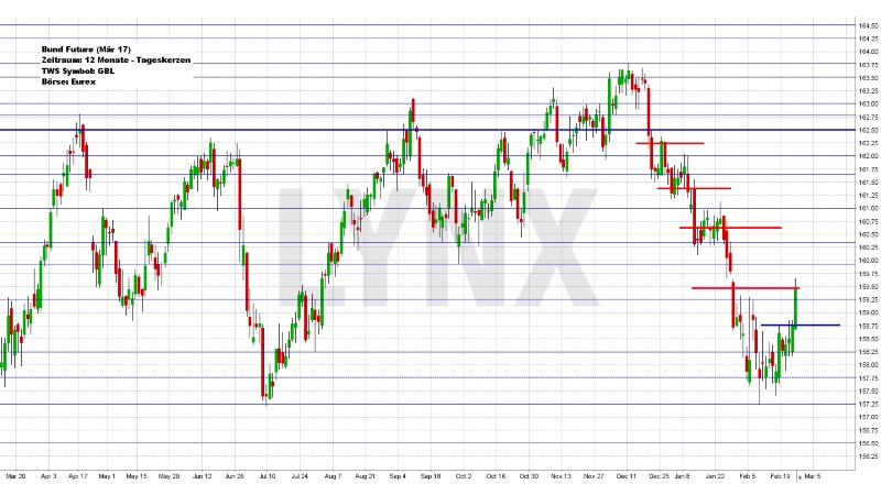 Montag und Dienstag konnte der Bund-Future die Abwärtsseite leicht ausbauen. Der Markt fiel nochmals kurzzeitig unter die Marke von 158,00, bevor er erneut in Richtung 158,75 stieg. Zum Freitag brach der Bund dann über dieses richtungsentscheidende Niveau aus und schaffte den Weg bis zum Wochenziel von rund 159,50. Diese Marke markiert gleichzeitig den Wochenschlusskurs. Eine Sequenz steigender Hochs und steigender Tiefs setzte ein. Oberhalb von 158,75 könnte es weiterhin zu leichten Erholungen kommen und der Bereich 160,00 sollte realistisch erreichbar sein. Konsolidierungen an Unterstützungen könnten gegebenenfalls interessante Einstiege ermöglichen. Sollte der Bund jedoch erneut unter die Unterstützung von 158,75 absacken, wären weitere Bewegungen in Richtung 158,25 und 157,75 und eine damit verbundene Aufnahme des übergeordneten Abwärtstrends denkbar.