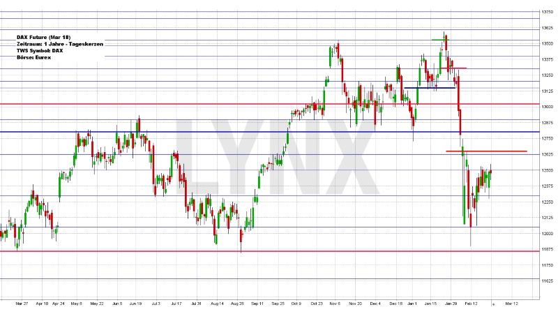 Der Deutsche Aktienindex beendete den Xetra-Handel am Freitag mit einem Plus von 0,18 Prozent bei 12.483,79 Punkten. Das Rekordhoch liegt bei 13.596,89 Punkten. Das Handelsvolumen betrug 3,699 Mrd. Euro. Der XDAX notierte um 22:15 Uhr mit 12.549,80 Punkten und der FDAX schloss an der EUREX mit 12.544,50 Punkten. Der Dow Jones beendete den Handel mit 25.309,99 Punkten und die Rekordmarke liegt bei 26.616,71 Punkten. Der NASDAQ 100 notierte zum Handelsschluss bei 6.896,60 Punkten und der Rekordstand beträgt 7.022,97 Punkte. Der breit gefasste S&P 500 schloss mit 2.747,30 Punkten und der Rekordstand liegt bei 2.872,87 Punkten. Der Euro notierte nach US-Börsenschluss bei 1,2295 US-Dollar. Eine Feinunze Gold war am Spotmarkt für 1.328,70 US-Dollar zu haben und Rohöl der Nordseesorte Brent kostete zum US-Handelsschluss im April-Kontrakt 67,31 US-Dollar das Fass. Der Euro-Bund-Future schloss am Freitag an der EUREX mit 159,53 Punkten. Die Rendite für zehnjährige Bundesanleihen liegt aktuell bei 0,65 Prozent. Der Spread zwischen zehnjährigen deutschen Bunds und zehnjährigen US-Staatsanleihen (2,87 Prozent Rendite) liegt derzeit bei 222 Basispunkten. Die Bundesfinanzagentur emittiert am Mittwoch im Rahmen einer Aufstockung Kapitalmarktinstrumente (Bund) mit einer zehnjährigen Laufzeit und mit einem Volumen von 3,0 Mrd. EUR.