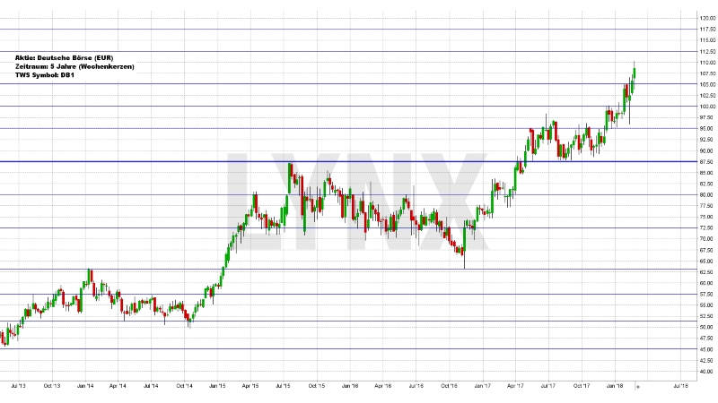 Die Aktie der Deutschen Börse zeigte in den vergangenen fünf Handelsjahren eine sehr gute Performance. Bis auf eine leichte Konsolidierungsphase von Juli 2015 bis November 2016, kannte der Wert fast nur steigende Kurse. Beginnend im Kursbereich um die 47,50 Euro ging es kürzlich hinauf auf rund 110,00 Euro – ein Anstieg von über 100 Prozent. Sehr schön war die saubere Trendbewegung zu beobachten. Gleich zweimal wurden die Ausbruchsniveaus von rund 62,50 Euro und 87,50 Euro direkt von oben getestet, bevor weitere steigende Kurse einsetzten. Der Schlusskurs zum Freitagabend der vergangenen Handelswoche lag im Bereich von knapp 109,00 Euro. Oberhalb von 95,00 Euro sollte auch in den kommenden Wochen und Monaten nichts gegen eine Fortsetzung des Aufwärtsvorteils sprechen, wodurch gegebenenfalls Kaufszenarien interessant werden. Weitere Bewegungshochs sind nicht auszuschließen und die Widerstandszonen 112,50 Euro und folgend auch 117,50 Euro könnten realistische Ziele darstellen. Sollte der Wert jedoch unter die Unterstützung von 95,00 Euro fallen, sollte mit Käufen vorsichtiger umgegangen werden. Ein nachhaltiger Bruch der Marke von 87,50 Euro würde den aktuellen Aufwärtsvorteil aus charttechnischer Sicht in Gänze unwirksam werden lassen. In diesem Fall ist eine erneute Analyse anzuraten.